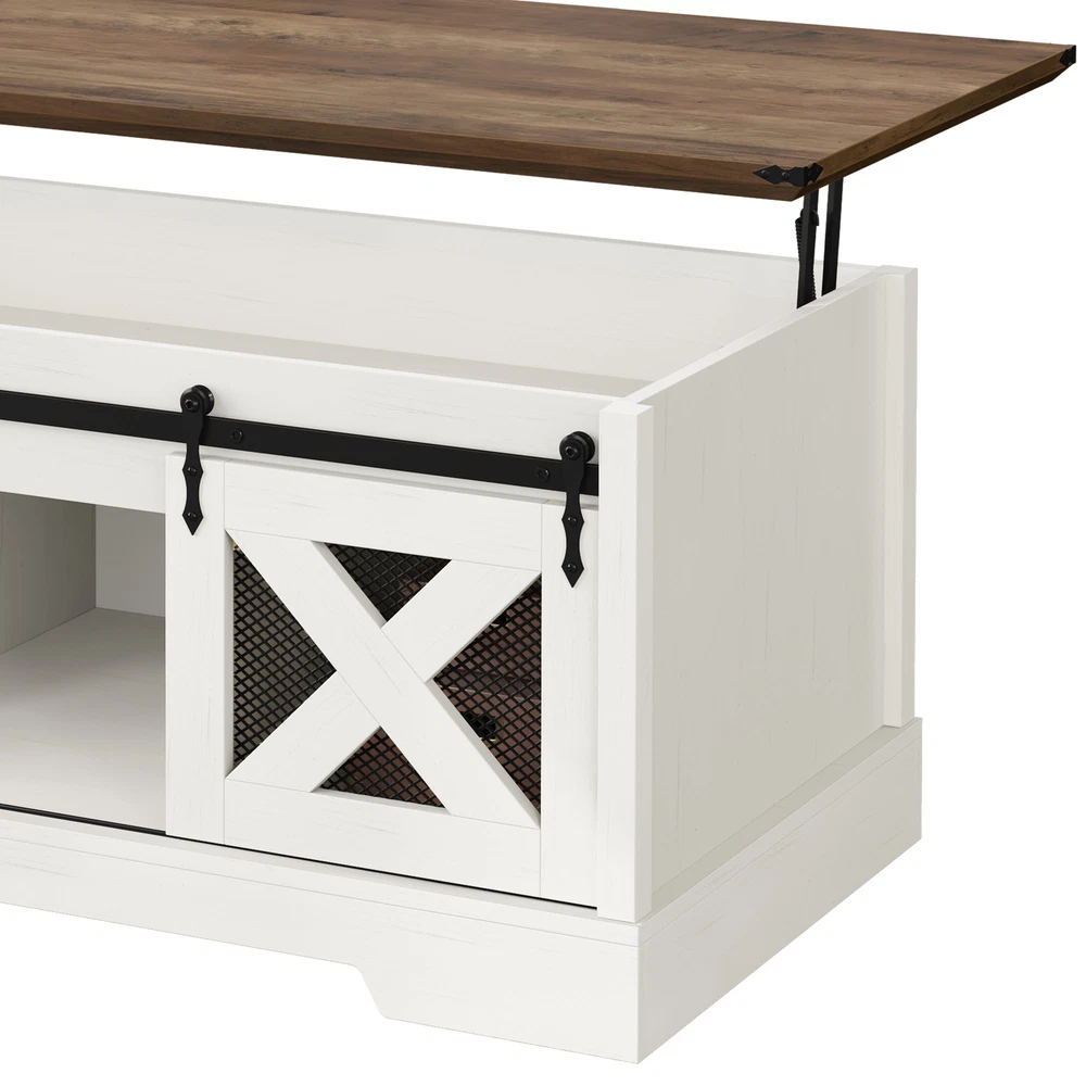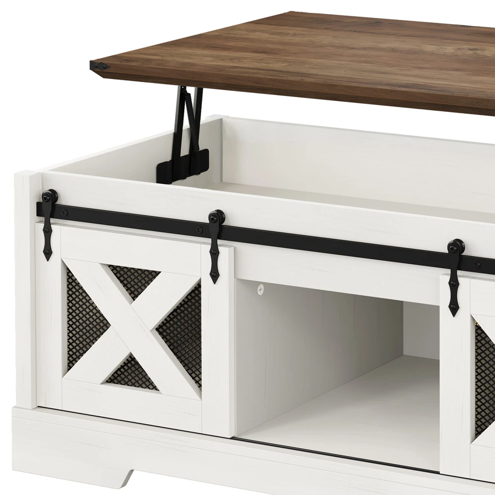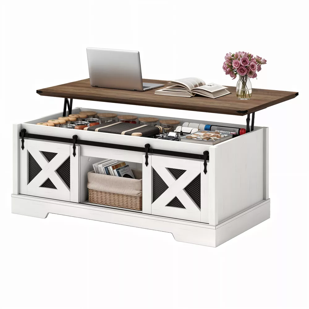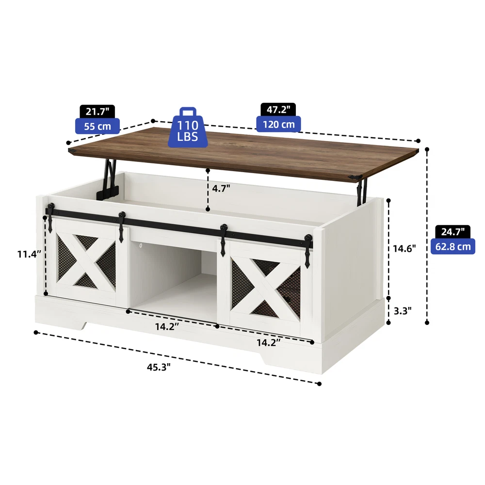 Barnhouse Lift Top Coffee Table Mesh Sliding Door & Hidden Storage for Living Room Product Description NOTE: Professional Installation Would Be Highly Recommended. Description : 1. Color: White & Brown 2. Materials: P2-Certified Particle Board, Metal, MDF/Chipboard 3. Room Type: Living Room, Family Room, Den, Home Office/Study, Entertainment Area, Sunroom 4. Feature: Lift Top Table, Multifunctional Storage, Barn Style Door, Iron Protective Corner, Protective Foot Pads, Robust Lifting System, Hidden & Open Compartment Underneath, Spacious Tabletop, Waterproof, Scratchproof, Easy to Assemble, Easy to Clean. 5. Weight Capacity: 110 lbs. Features: 1. Versatile Storage Table: Elevate your living space with a lift top coffee table that not only provides a flat surface for your everyday needs but also includes ample hidden storage compartments . Ideal for storing books, electronic devices, and other essentials, its innovative design allows for easy access while maintaining a tidy and stylish appearance. 2. Elegant Barn Doors: This storage unit features stylish barn-style doors that slide smoothly to offer easy access while keeping contents dust-free and neatly organized. The aesthetic appeal of the barn doors adds a rustic charm to your decor , making it a perfect blend of functionality and style for living rooms or bedrooms. 3. Durable Construction Details: The storage unit is built with a robust lifting system that ensures easy and safe operation of the lid, while reinforced corner iron adds extra durability and longevity to the structure. Additionally, slip-proof pads on the base protect your floors from scratches and keep the unit stable, enhancing both usability and safety. 4. Rustic Storage Bench: The bench is crafted with waterproof and scratchproof materials , making it highly durable and suitable for everyday use in busy areas like living rooms or entryways . Protective foot pads ensure the flooring remains unscathed, adding to its practicality and suitability for various home settings. Dimensions: 1. Overall Dimensions: 47.2"L x 21.7"W x 24.7"H Package Included: 1. 1 x Coffee Table 2. 1 x Accessory Kit 3. 1 x Instruction Manual Note: 1. During assembly, do not tighten screws until all holes are aligned. 2. Confirm the appropriate furniture size for your needs prior to purchase. 3. There may be a slight color discrepancy between the product as seen on your monitor versus in real life. 4. Do not expose the product to extreme sunlight. To extend product lifetime, cover item when not in use. 5. Contact us immediately if any components are missing or damaged upon arrival. Our customer service team will resolve your issue right away. Shipping 1. Normally the item will be dispatched within 1 business day if payment is cleared before 12 pm PST. 2. Please verify the correct shipping address in your PayPal account before making the payment. We only dispatch the item to the address that is sent to us at the time of checkout. 3. We don't ship to Hawaii, Alaska, Puerto Rico, APO/FPO/PO Boxes. 4. We don't provide local pick-up service. 5. Normally we will use USPS, UPS, FedEx & LTL to dispatch items. Payment 1. We accept PayPal and credit card. 2. We will ship to the confirmed Paypal shipping address that is provided with the payment only. Return 1. 30 days Money Back Guarantee. 2. Please contact our customer service to receive a RMA form first if want to return the item. 3. All returned items MUST in new condition with the original package. Contact If has any problem, please contact us by sending an ebay message. Our customer service will resolve the problem as soon as possible. On Feb 17, 2025 at 23:21:43 PST, seller added the following information: