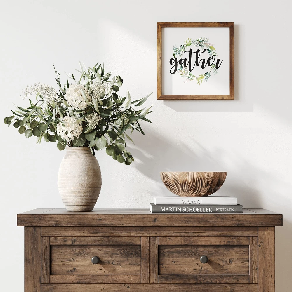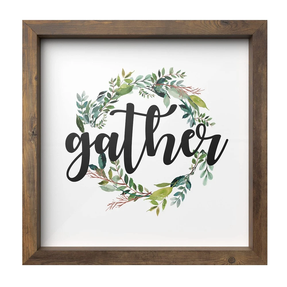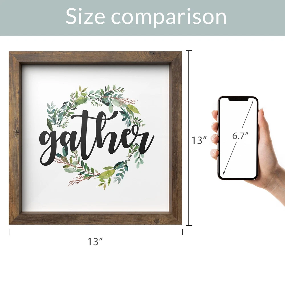 Barnyard Designs Gather Sign Rustic Primitive Country Farmhouse Home Decor Wall Sign 13" x 13” Product Details Color: Gather Brand: Barnyard Designs MPN: FM18J0129-A UPC: 750325932578 EAN: 0750325932578 Product Dimensions: 12.99 x 12.99 x 0.04 inches Item Weight: 12 ounces Manufacturer: Barnyard Designs Country of Origin: China Item model number: FM18J0129-A Is Discontinued By Manufacturer: No Finish types: Unfinished Number of pieces: 1 Batteries required: No Gather sign decor - Welcome your guest in a warm and loving way during the holiday season with this rustic home decor sign. It will add a bohemian and festive touch. Rustic primitive country accent - This beautiful wall art with an unfinished wood frame will bring an old vintage, primitive theme to your decor. Ready to hang - This wall sign comes ready with pre-installed mounting hooks. Leave it displayed as decor on a shelf, mantle or counter top leaning against a wall. Makes a great gift - Makes a great gift to friends and family. Home decor that will look great as festive decor for thanksgiving, Christmas and holiday parties. Dimensions - 13" x 0.75" x 13".