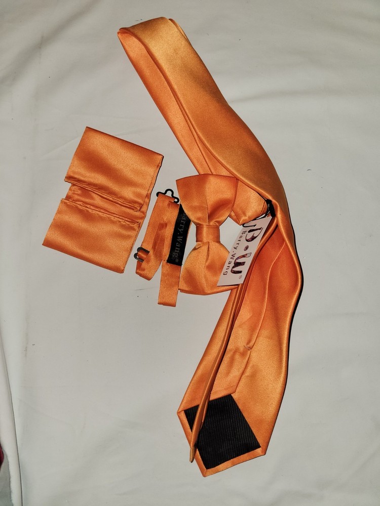 The Barry Wang tie and bow tie set in orange silk is a stylish and sophisticated accessory for men. The set includes a high-quality bow tie made from luxurious silk, perfect for adding a touch of elegance to any formal outfit. The orange color adds a pop of vibrancy and personality to the ensemble, making it a standout piece for any event or occasion. Made by the reputable brand Barry Wang, this set is sure to elevate any man's style and give a polished finish to his look.
