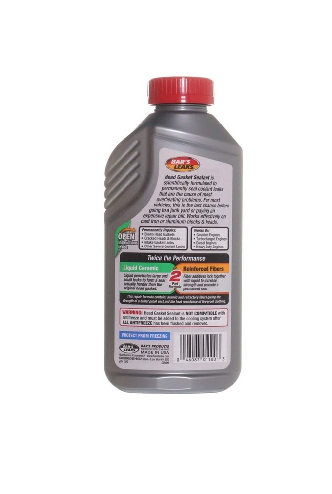{{title} Bar's Leaks 1100 Head Gasket Repair - 20 oz. Description For most vehicles, this is the last chance before going to a junk yard or paying an expensive repair bill. This product contains a blend of aramid and refractory fibers giving the strength of a bullet proof vest and the heat resistance of fire-proof clothing. As these particles penetrate a crack or the blown head gasket area, they lock together and bond forming a hard permanent ceramic type seal. Your vehicle is a good candidate for this product if it can idle for 20 minutes without overheating or having to add coolant. Works effectively on cast iron or aluminum blocks & heads. Detailed instructions on back booklet label take you through each step of using the product. Features: Stops block leaks Seals cracked cylinder heads and blocks Repairs blown head gaskets Dual Action 2 Part Formula LIQUID CERAMIC: Liquid penetrates large and small leaks to form a seal actually harder than the original head gasket REINFORCED FIBERS: Fiber additives lock together with liquid to increase strength and promote a permanent seal Head Gasket Sealant is NOT COMPATIBLE with antifreeze and must only be added to the cooling system after ALL ANTIFREEZE has been flushed and removed. Included components: Unit, Instruction Guide Product Details: Product Dimensions: 1.8 x 3.4 x 8.3 inches Item Weight: 1.41 pounds Department: unisex-adult Manufacturer: Bar's Leaks Country of Origin: USA Item model number: 1100 Is Discontinued By Manufacturer: No Delivery We Do Not Ship Outside of the Continental US. Return Policy All items qualify for returns within 30 days of receipt. Buyer is responsible for return shipping on any item that is not damaged. Feedback We take our reputation seriously, we buy and sell online, so we understand the value of trust. If you are unsatisfied with your order, please contact us and we will work with you to resolve it to your satisfaction. Delivery We Do Not Ship Outside of the Continental US. Return Policy All items qualify for returns within 30 days of receipt. Buyer is responsible for return shipping on any item that is not damaged. Feedback We take our reputation seriously, we buy and sell online, so we understand the value of trust. If you are unsatisfied with your order, please contact us and we will work with you to resolve it to your satisfaction.