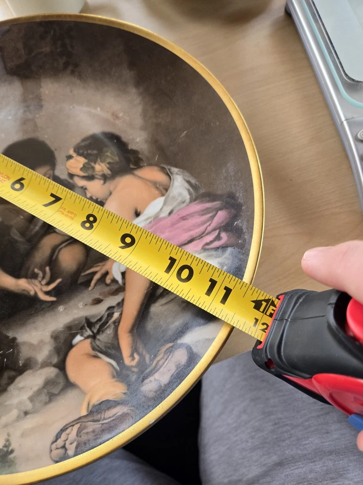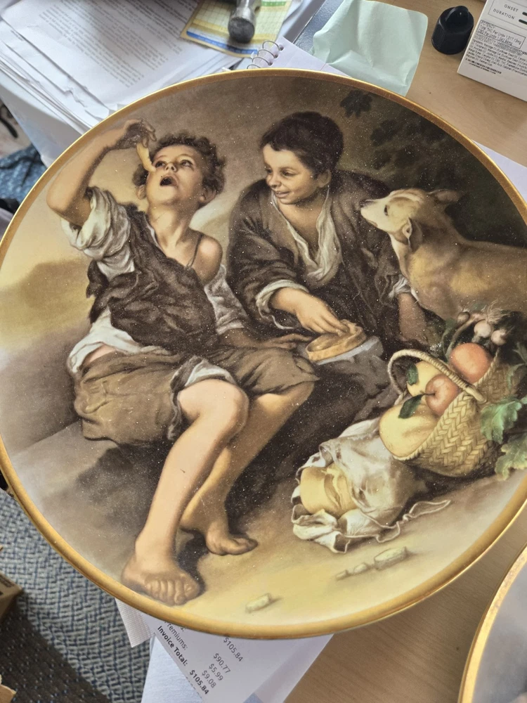 This vintage collector plate features two artworks by Bartolome Esteban Murillo, "The Pie Eaters" and "Beggar Boys Playing Dice". It is round, 7 inches in diameter, made of multicolor bone china, and part of the Street Urchin Series by Crown Staffordshire. Produced in Germany in the early 20th century (1930-1939), it showcases art pottery production techniques in a German cultural style.