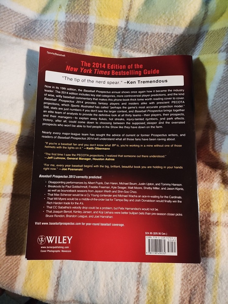 This is the Baseball Prospectus 2014 book by Baseball Baseball Prospectus. It is a trade paperback edition published by Wiley & Sons, Incorporated, John. The book is 608 pages long and measures 11 inches in length, 8.5 inches in width, and 1.2 inches in height. The intended audience for this book is adults interested in fantasy sports, baseball, and statistics. It is the third edition of this book, published in 2014. The book is written in English and covers topics related to baseball, including statistics, fantasy sports, and general baseball information. This book is perfect for anyone interested in baseball who wants to stay informed about the sport.