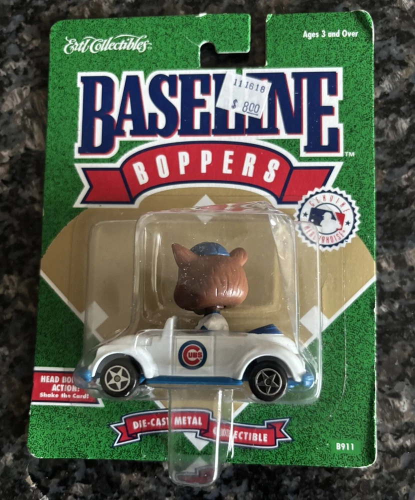 This collectible car is a must-have for any Chicago Cubs fan! Featuring the team's beloved mascot, Baseline Boppers, this die-cast metal car is a perfect addition to any sports memorabilia collection. Made by Ertl, this officially licensed piece is a great way to show your support for the team and their iconic character. The white car is designed with intricate details and is perfect for display on your shelf or desk. This item is a great find for any baseball or Chicago Cubs fan, and is sure to be a conversation starter. Add this unique piece to your collection today!