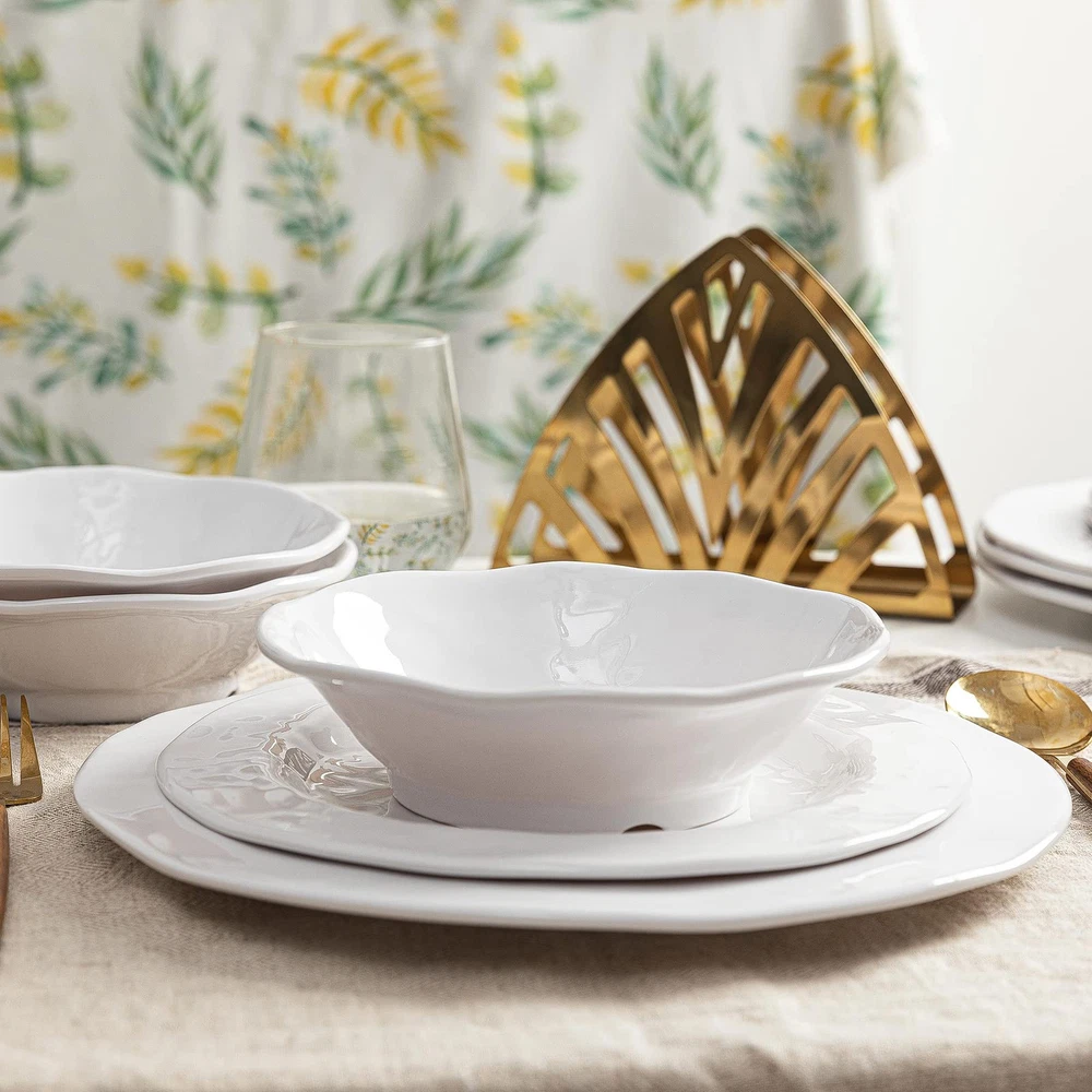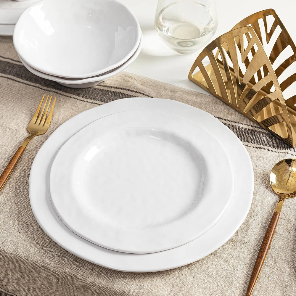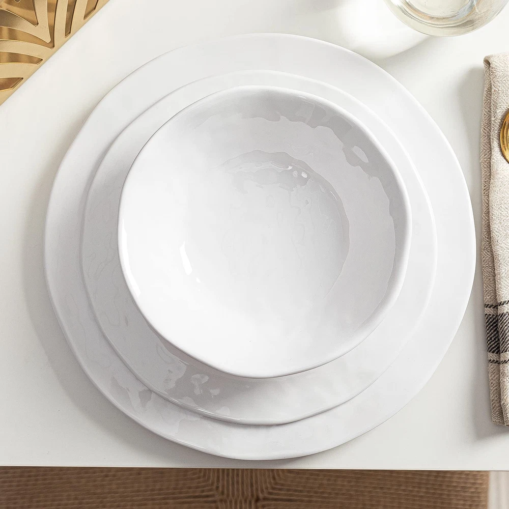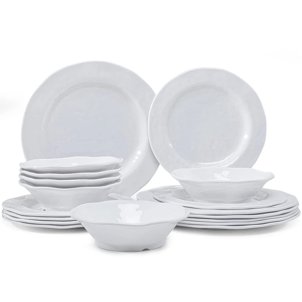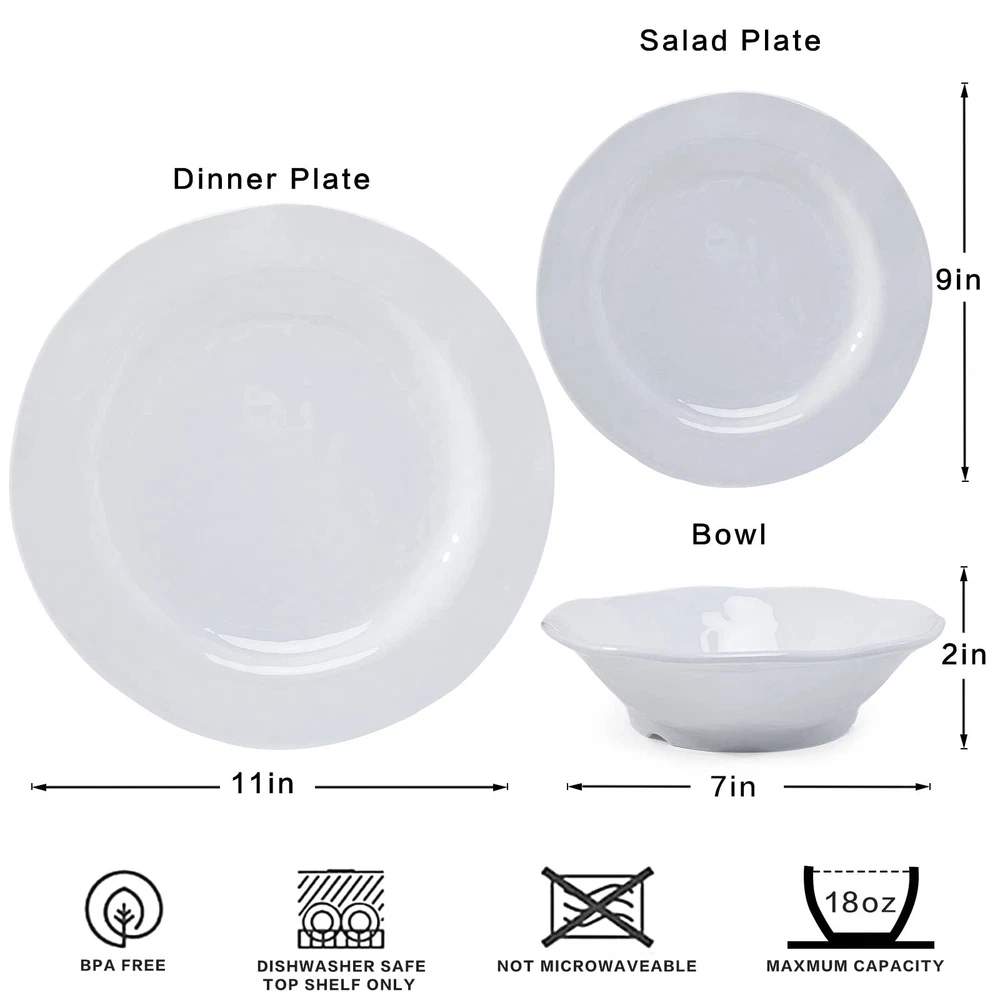 BASIC WHITE MELAMINE DINNERWARE SET: Dinner Service for 6 which Including 6pcs 11" dinner plate, 6pcs 9" salad plate, 6pcs 7" x 2"H all purpose bowls(18oz) BPA FREE 100% PURE MELAMINE MATERIAL: dinnerware is made of durable 100% pure melamine(no filler mixed), completely food safe and certified BPA free, more substantial and sturdy than other typical melaine dishes PERFECT FOR EVERYDAY USE AND OUTDOOR USE: Lightweight enough to easily take them on your patio, poolside, picnics at the beach or park, also a great choice for holiday parties or weddings, don't worry about damage because they are unbreakable, safe for daily use CARE INSTRUCTION: Easy to clean, this white dinnerware set can be used in the TOP SHELF of dishwashers, the shine stays after several cleaning, makes your life more convenient, DO NOT use for MICROWAVE or OVEN GREAT AFTER SERVICE: Free if you received a damaged or defective item, please feel free to with us, our team will respond to you within 24 hours