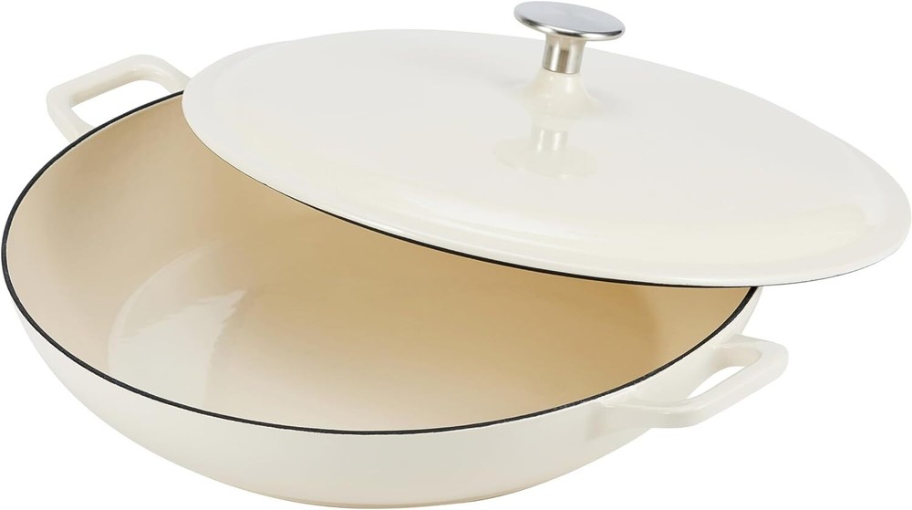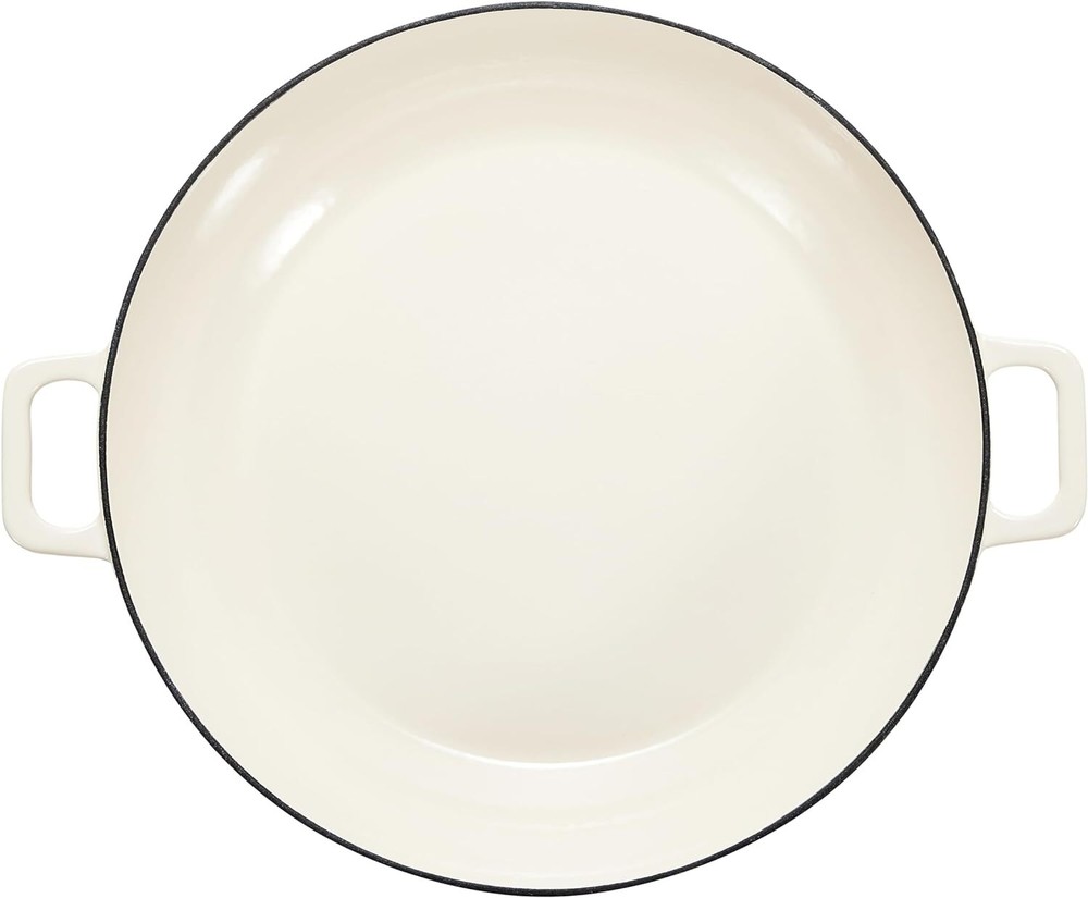 Casserole cast iron skillet in white with loop side handles for easy transport Oven safe up to 500 degrees F Cast iron for even heat distribution and retention Enamel doesn't have non-stick function Holds 3.3 Quarts Always use hot-pads, oven mitts, or potholders while moving or removing cast iron cookware on or from the stove or oven. Brand Amazon Basics Material Cast Iron Capacity 3.3 Quarts Color White Finish Type Enameled 5890274 On Feb 25, 2025 at 22:21:21 PST, seller added the following information: