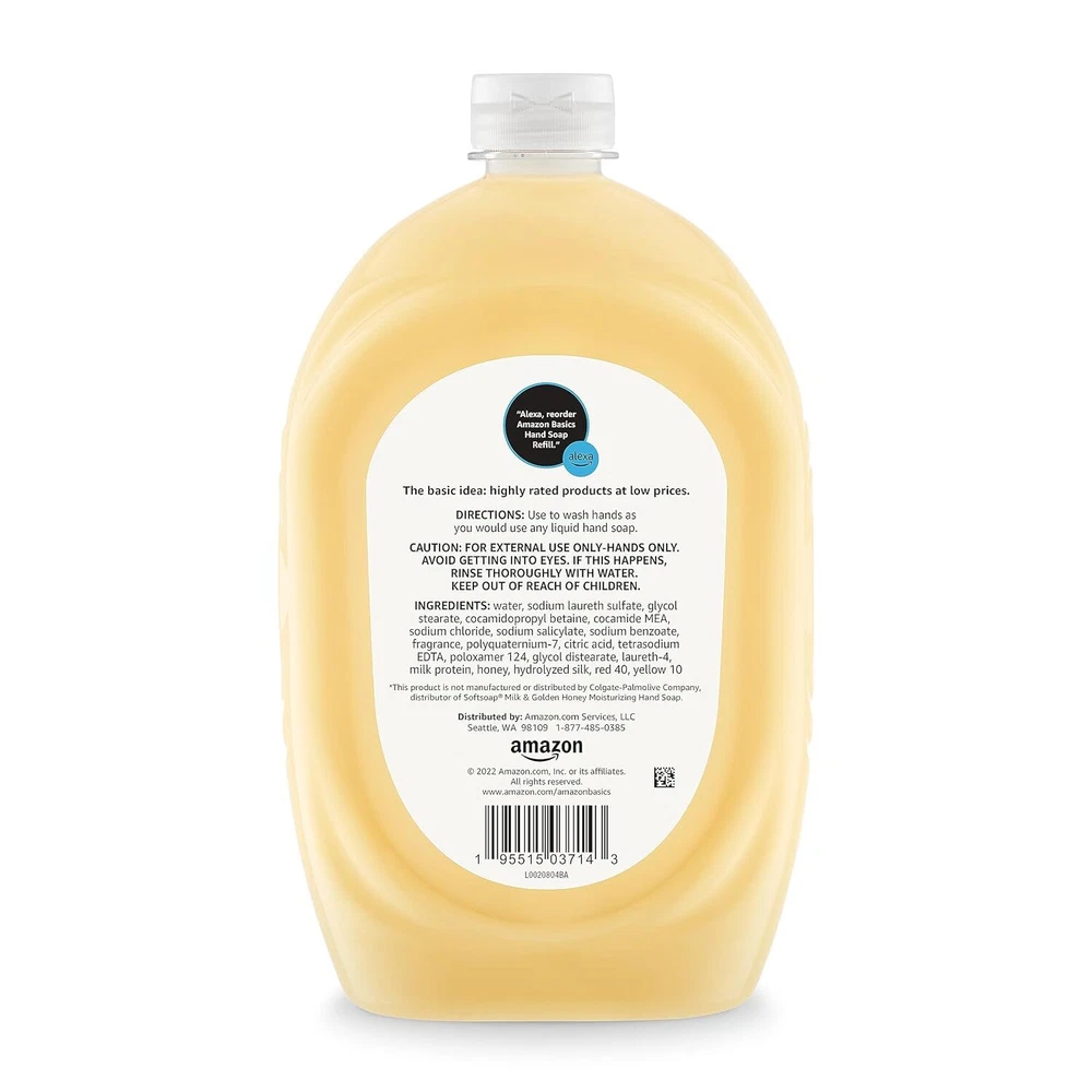 About this item One 50 fluid ounce bottle of milk and honey liquid hand soap refill Amazon Basics liquid hand soap is dermatologist tested and pH balanced Formulated without triclosan, phthalates, parabens and formaldehyde donors If you like Softsoap Moisturizing Liquid Hand Soap, Milk & Golden Honey, we invite you to try Amazon Basics Liquid Hand Soap Refill, Milk and Honey Running low? Restock by asking, "Alexa, order Amazon Basics Hand Soap Refill" through your Alexa device.