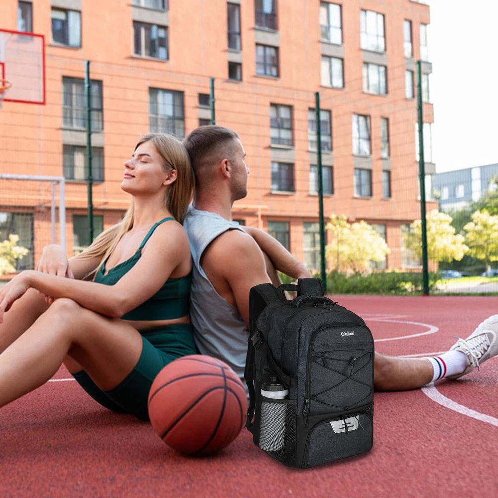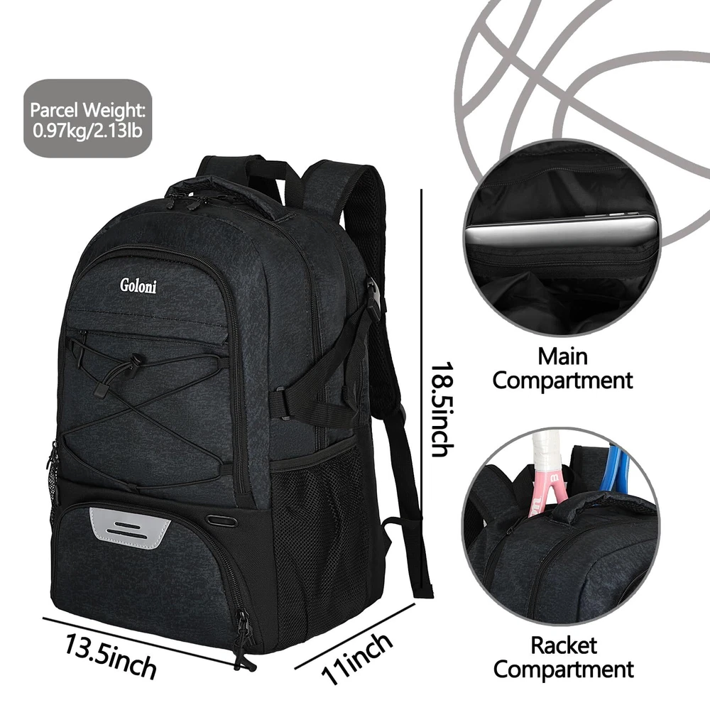 【Fabric】: The basketball backpack is made of durable 100% polyester material,water-resistant.reinforced stitching provide strength and durability for sports enthusiasts,multifunctional and easy to clean 【Large Capacity】:Basketball bag keeps everything organized and in one spot,ball,clothes,water bottle,key,wallet,shoes,even your laptop 【Padded Shoulder and Back】:Padded parts provide comfortable carry,great reduce pressure for shoulder and back from the back pack 【Full-size Ball Compartment】:Big ball compartment for basketball,football,volleyball,can use as soccer backpack,tennis backpack,work or daily use 【Attention】: If this sports bag is equipped with tennis rackets, it will be somthing crowded to carry football or basketball. Please with us if you have any doubt with our backpack, we will be there for help