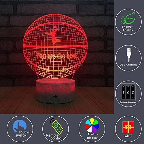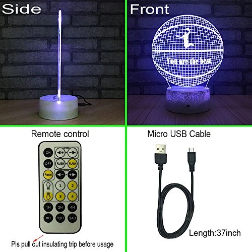 30 Days Return Policy Fast Delivery Trusted seller Basketball Beside 7 Colors Change + Remote Control with Timer Night Light Optical Illusion Lamp As a Gift Ideas for Boys or Kids, Assorted/ Acrylic, Multicolor Product Description Touch Control: red, green, blue, yellow, cyan, purple, white, colour changing. can fixed one colour or 7 colour gradual changing. Durable base in which t are 10 LED beads, powered by 3-AA batteries or 5V USB Cable connected to PC or your home adaptor. The Perfect Gift: simple and stylish design, suit for birthday, anniversary, housewarming, graduation, engagement, valentines, romantic time and many other special occasions. Perfect decoration for bedroom, child room, living room, bar, shop, Cafe, restaurant, and anyw you like. NOTICE: 【3D just Visual Effect, the lamp itself is Flat Unique Lighting Effects Amazing Optical Visual Illusion Home Decor Lamp. If you have any questions, please contact me and I will deal with them in time. Shipping Returns Payment Shipping Shipping is FREE to all addresses other than APO/PO boxes in the lower 48 states. All our stock ships from US-based warehouses. Shipped via USPS or UPS (depending on location and package weight) Unless stated otherwise, all orders will ship within 24-72 hours of your payment being processed. Check our feedback to see the great reviews of FAST shipping we offer. Returns As our valued customer, we will do our best to make sure the product you receive arrives to you on time and as expected. If you are not satisfied with your purchase, please contact us within 30 days of receiving your order to process a return. Payment We currently accept payment via eBay managed payments only. Once payment is cleared, we will dispatch your shipment within 1-3 business days. Please refer to the "Shipping" tab for more information regarding shipping speed to your destination.