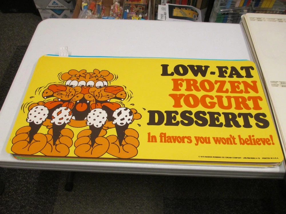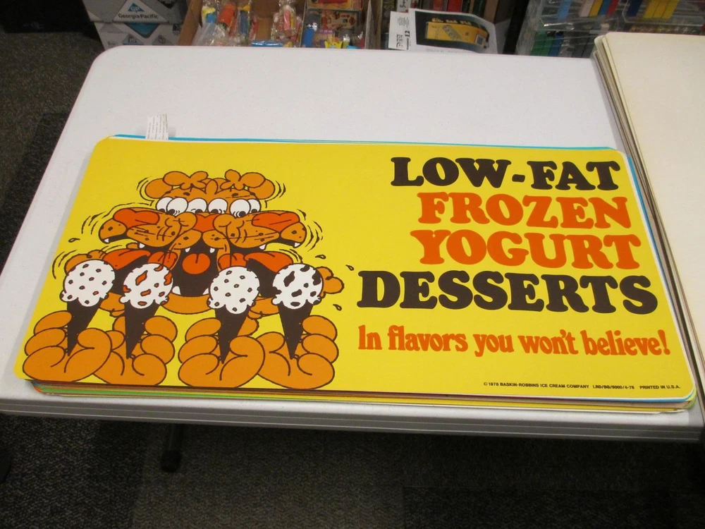 ITEM DESCRIPTION Baskin Robbins ice cream 1978 store poster sign FROZEN YOGURT triple lion LowFat $200.00 NOTE--photo shows a stack of signs, this listing is for top one only ! this sign is made of thin cardboard SIZE-- 28" x 14" CONDITION--fine to excellent, might have minor tape residue marks on back obtained from a man who owned 2 different Baskin Robbins stores in Ohio from the late 1960s to late 1980s. This collection contained 1000s of items and was mostly in stellar condition. Click HERE to see all the BASKIN ROBBINS items I have listed on EBAY ! OFFERS ---I list 20,000+ items a month on EBAY. It is easier to put Best Offer on everything but because I lose 15% to EBAY fees no matter what, I may not be willing to take offers on everything I have listed. COMBINED SHIPPING ? YES...I can do this but ONLY If you follow the below instructions. To be clear, "combined shipping" is when you buy 3 items, for example, each with a shipping charge of $8, but since I can ship all 3 in the same box, you get charged $10-12 instead of $24. I cannot "combine shipping" after you have already paid. 1) DO NOT USE the cel phone app ! If you do, EBAY will force immediate payment and charge you full shipping on each item. I will not refund your money if this happens. 2) You must log into EBAY with a browser (Chrome, Safari etc) on your phone, computer or laptop to avoid this. 3) Put all items in your Cart and then, while in your Cart, click the "Request Total" link. "Request Total" will not be visible if you click "Checkout" under your Cart icon. You must click "View Cart" under your Cart icon. The URL should say cart.ebay.com Because EBAY and PAYPAL have made partial refunds so complicated, I will no longer be refunding $ if you do not follow these instructions. MY PHOTOS - If more than 1 item is shown in a photo--- then items are in SEPARATE listings unless otherwise stated ! Read description! PAYMENT-General Info PAYMENTS- USA Various payment options will show during checkout. Contact me if you need another payment option. EBAY is charging sales tax. Sellers have no control over that. PAYMENT-FOREIGN ORDERS Various payment options will show during checkout. Contact me if you need another payment option. SHIPPING COST ? .... see "SHIPPING COSTS : Shipping-Foreign" (shown below). CUSTOMS CHARGES -- your country may charge you customs fees before you can receive the package. This is not my responsibility NOR is it part of my shipping charge. It is a fee charged by the country you live in. SHIPPING COSTS SHIPPING-USA FIXED SHIPPING RATE = actual shipping cost & insurance & small handling fee ($2 or less). West Coast may be significantly higher on larger or heavier items. FYI here is what the US Post Office currently charges : SHIPPING-FOREIGN For UK, Canada,and Australia , PLEASE check with me first to make sure shipping charges EBAY has listed are correct! In the last few years, there have been HUGE increases in shipping cost outside the USA. The shipping cost listed is usually for FIRST CLASS shipping. The USPS will only insure Priority and Express shipments. ******There is a $2-$5 handling fee for foreign orders. ========================================================= Offered by DAVID WELCH ------ author of COLLECTING PEZ 1995 and Pictorial Guide to Plastic Candy Dispensers 1991. I have been a full time antique and collectibles dealer since 1989 and have been collecting since the early 1970s. I have been on EBAY since 1997. If you have questions about any negatives I have received, feel free to ask. THANK YOU TO THE PATIENT AND REALISTIC PEOPLE WHO MAKE 98% of EBAY DEALINGS A PLEASURE. I have been on EBAY since 1997 and this company's ability to make simple things needlessly difficult is unmatched by anything I have experienced elsewhere. ===================================================================== Powered by SixBit's eCommerce Solution
