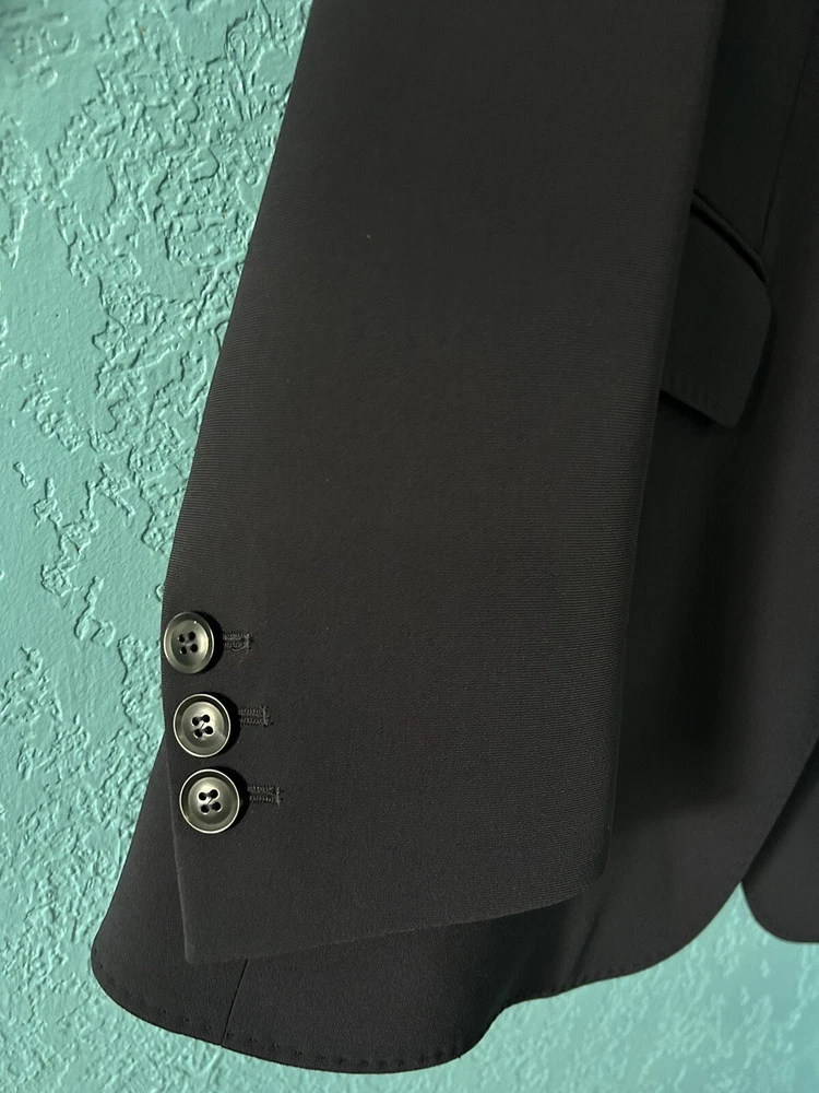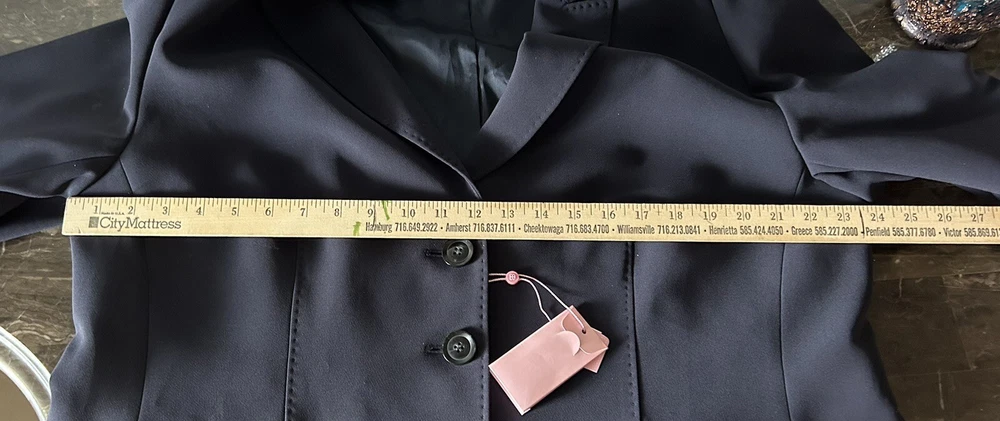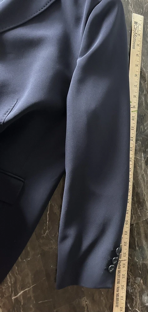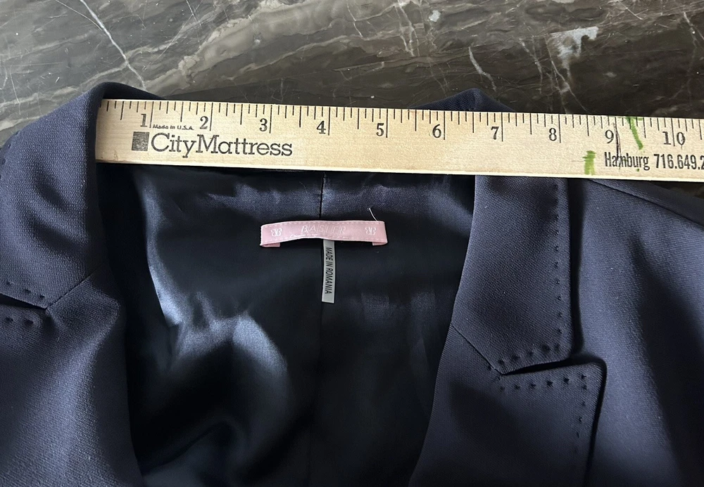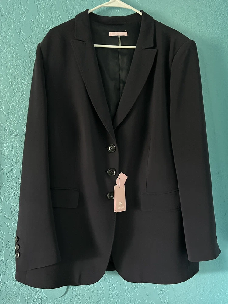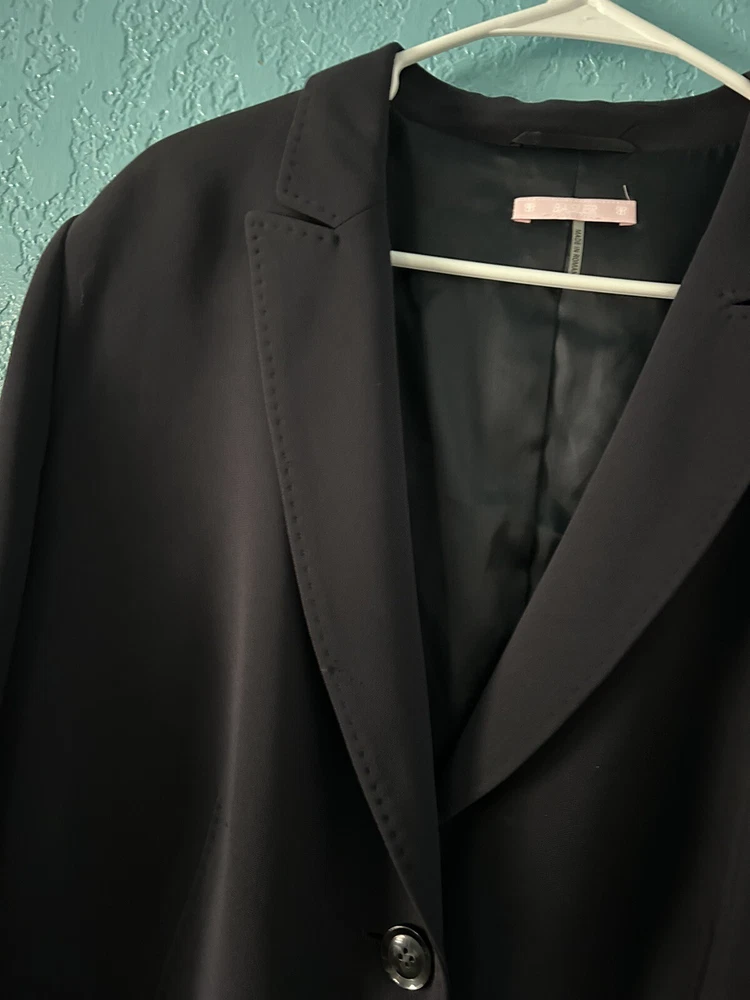 Basler 3 Button Front Blazer Jacket Color: Dark blue almost black Size FR 48.fits US:16 Pre Owned Please see pictures for measurements and details. Last picture show mark for wear a brooch .