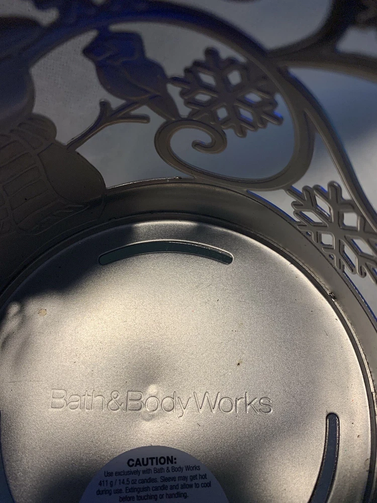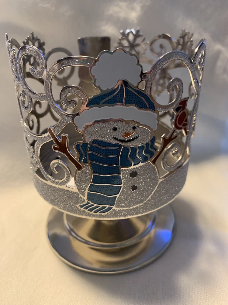 Bath and Body Works large holiday candle holder. Features a snowman on two sides. Silver with snowflakes throughout.
