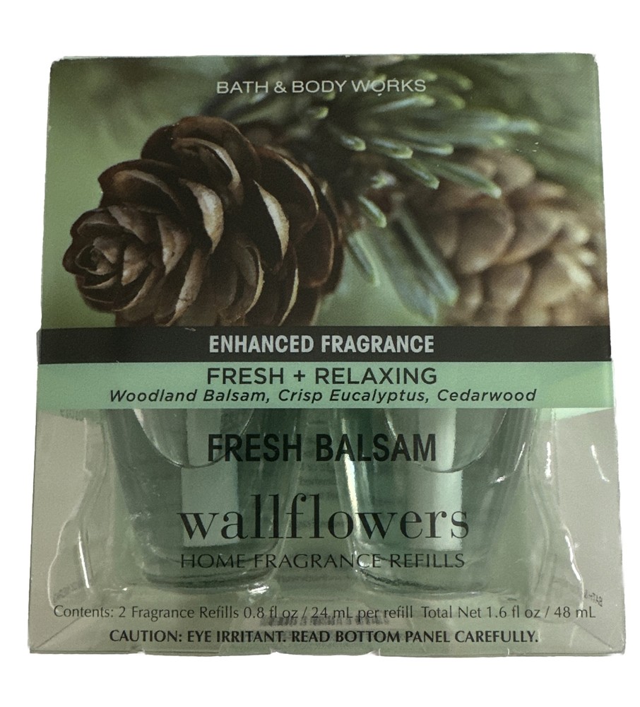 Features: Deodorizer, Diffuser, Odor Eliminator Brand: Fresh UPC: 0667557266909 Occasion: Winter Size: 1.6 fl oz Department: Adults Material: Glass Form: Oil Number in Pack: 2 Installation Area: Device Theme: Cedar gtin13: 0667557266909 Power Source: Wall Plug-In Scent: Balsam Fir, Eucalyptus, Cedarwood Product Line: Wallflowers Room: Bathroom Color: Green Model: Fresh Balsam Type: Refill Effect: Boost Energy Levels Manufacturer: Bath And Body Works