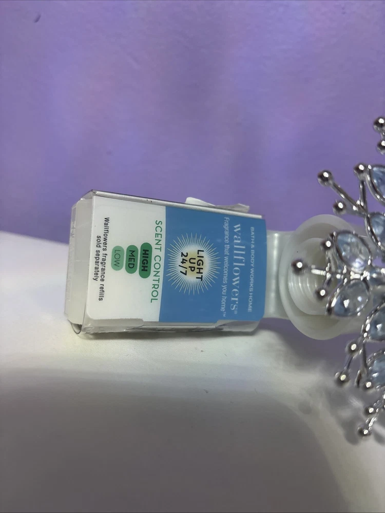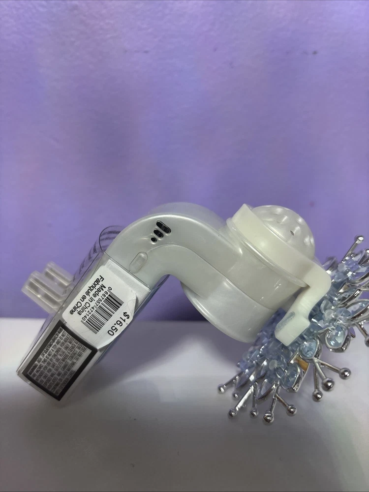 This Bath & Body Works Blue Snowflake Wallflower Plug-In features a jeweled snowflake design suitable for Christmas. It is made of plastic, manufactured in 2024 in the United States. The wallflower bulb plug-in is intended for adults and includes a diffuser. The scent is not included, and the brand is Bath & Body Works. Perfect for adding a festive touch to your home fragrance collection.