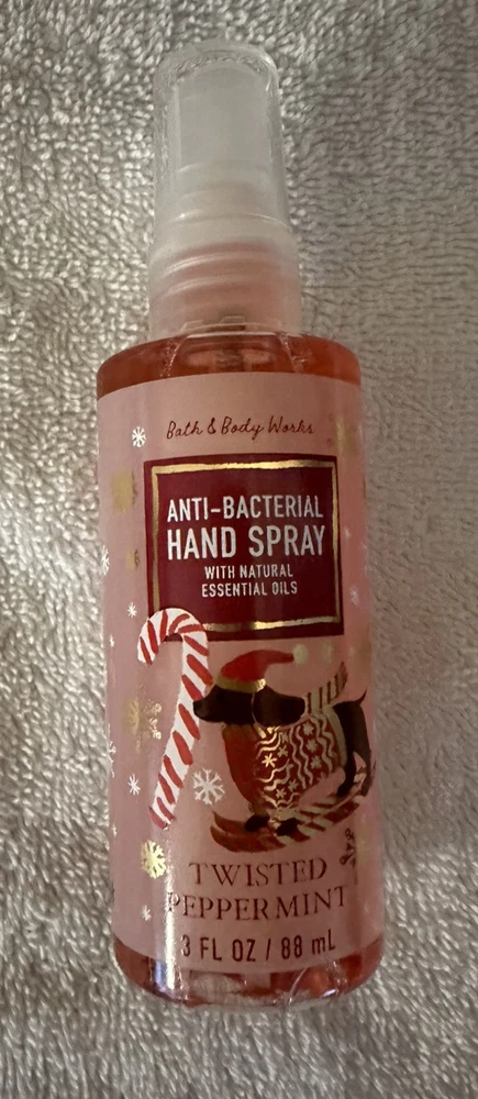 Bath & Body Works Anti-Bacterial Hand Spray with Natural Essential Oils-3 fl oz Twisted Peppermint Use to decrease bacteria on hands.