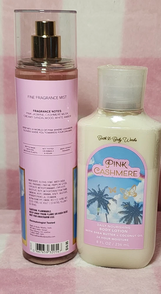Bath & Body Works Pink Cashmere Mist And Lotion Set- NEW. Brand new, no longer sold set of Pink Cashmere fine fragrance mist and lotion from Bath & Body Works. No longer sold! Ships with care from smoke-free home. Interested in bundle offers? Looking for something specific? Shoot us a message!