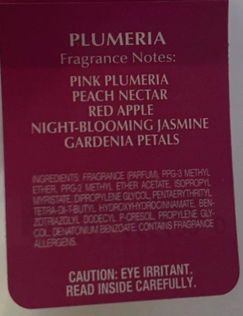 This is a Bath & Body Works Plumeria Wallflower Refill, designed for adults. It comes in a glass bottle and contains scented oil in a multicolor shade. The refill is intended for use with a wallflower plug-in air freshener to add a pleasant fragrance to your home.