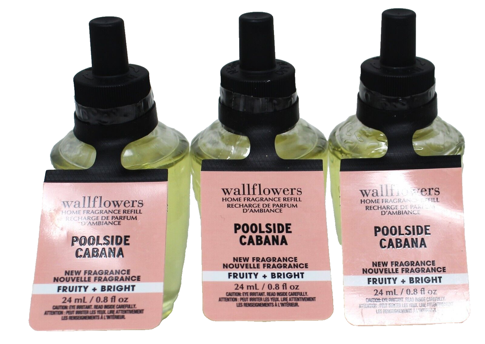 <div style="text-align:center"><img src="http://ti2.auctiva.com/sw/java.gif" border="0"><br><table align="center"><tr><td><a style="text-decoration:none" href="http://emporium.auctiva.com/Dimpl28" target="_blank"><img src="http://ti2.auctiva.com/sw/browse2.gif" border="0"></a></td><td height="21px" valign="middle" align="center"><font face="arial" size="2"><b><a href="http://emporium.auctiva.com/Dimpl28" target="_blank">Dimpl28</a> Store</b></font></td></tr></table></div> <img src="http://ti2.auctiva.com/web/aswCredit.gif" border="0"><br><a href="http://www.auctiva.com/?how=scLnk0" target="_blank"><img src="http://ti2.auctiva.com/images/sc1line0.gif" border="0"></a> Bath & Body Works Poolside Cabana Wallflowers Plug In Refill Bulb Lot of 3 We have been selling on eBay since 2002 and have always had a good standing with eBay due to our integrity. All our products are 100% authentic. To sell anything other than that is illegal and immoral. We do not ship internationally unless it's to a military address, in which case, we are honored to do so. All orders are double checked before shipping out to avoid any mistakes. We are honest and upfront about items and the condition of items. Once an item is purchased, the address cannot be changed nor can the order be canceled. Our handling time is 2 days, unless we’re out of town and then it will be changed to reflect any delay. Our customers make this business possible and I truly appreciate each & every one of you! Thank you!