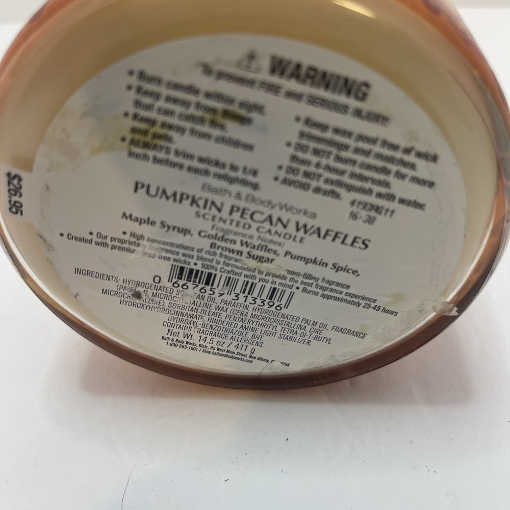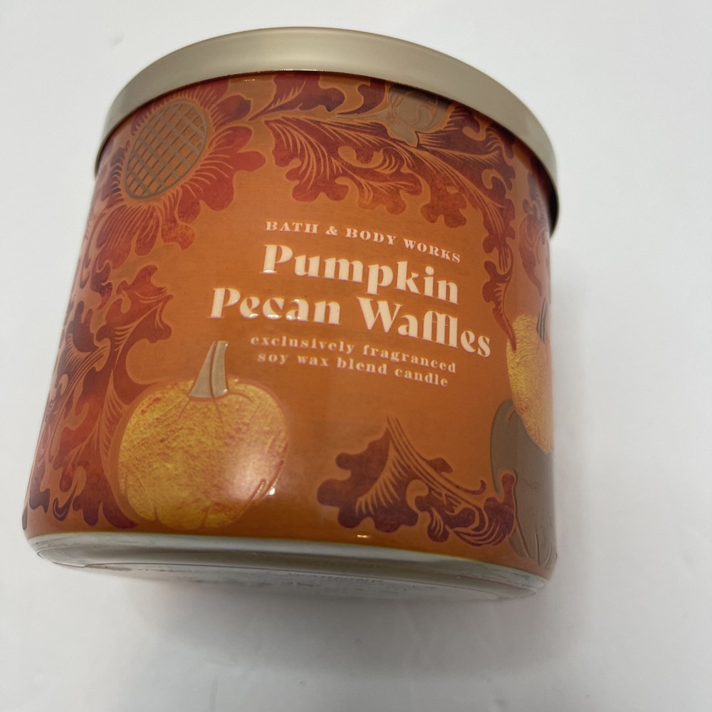 The Bath & Body Works Pumpkin Pecan Waffles 3-Wick Jar Candle is a large 14.5 oz soy wax candle in a modern white jar. With a seasonal theme and 3 wicks, this candle promises a burning time of more than 5 hours. The candle features a delicious scent of Pumpkin Pecan Waffles, perfect for any room in the house. Made in the United States by Bath & Body Works, this jar/container candle is a must-have for those who enjoy cozy seasonal scents in their home.