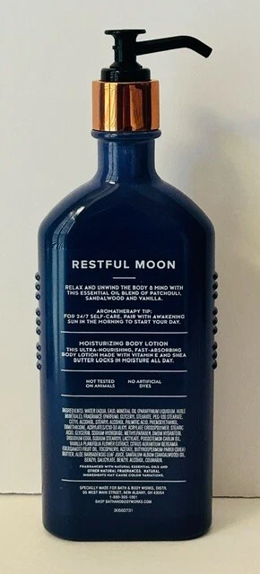 NEW Bath & Body Works Restful Moon Moisturizing Body Lotion 6.5 oz NEW. This popular ultra-nourishing, fast absorbing body lotion is made with vitamin E and shea butter and locks in moisture all day. Relax and unwind the body and mind with this essential oil blend of patchouli, sandalwood and vanilla.