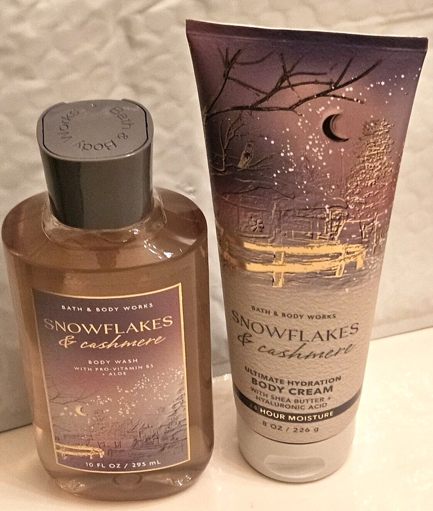 Bath & Body Works Snowflake and Cashmere Scented Shower Gel Wash and Body Lotion Full Size Body Cream 8 oz Body Wash 10 oz