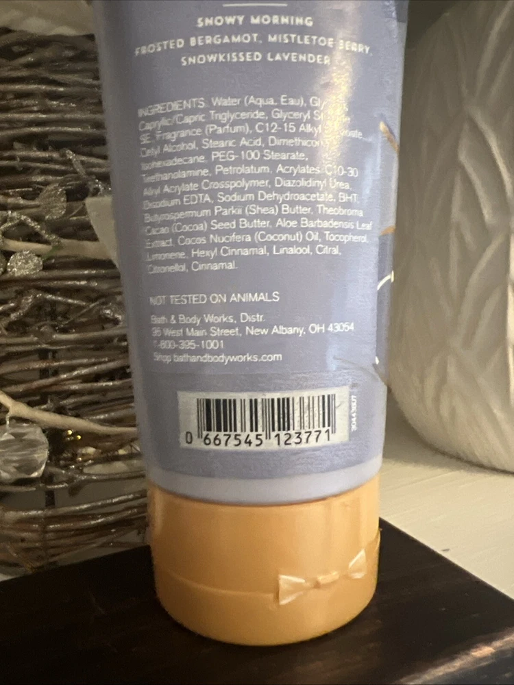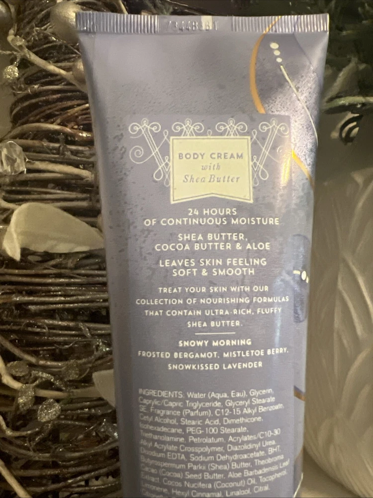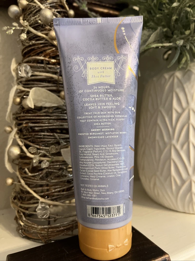 Fragrance Name: Snowy Morning Country of Manufacture: United States Formulation: Cream Department: Unisex UPC: 0667545123771 Size Type: Regular Scent: Bergamot, Mistletoe Berry, Lavender Brand: Bath & Body Works Type: Daily Use Size: 8 oz/226 g each Body Area: Full Body gtin13: 0667545123771 Product Line: benefit Total Moisture Main Purpose: Moisturizer Ingredients: Shea Butter