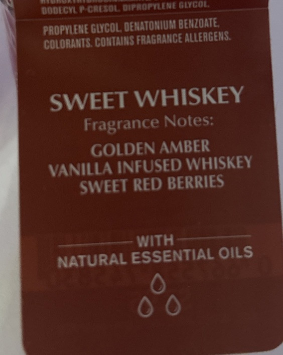This Bath & Body Works Sweet Whiskey Wallflower Refill is a 24 ml liquid fragrance refill made of glass. It is designed for use with a wall plug-in diffuser in a bathroom. The refill is 100% concentrated and provides a motivation & positive energy effect. It is spill-proof, pet safe, and eco-friendly, leaving no residue. The fragrance has a slow burning feature and eliminates odors, making it ideal for adults seeking an aromatherapy experience.