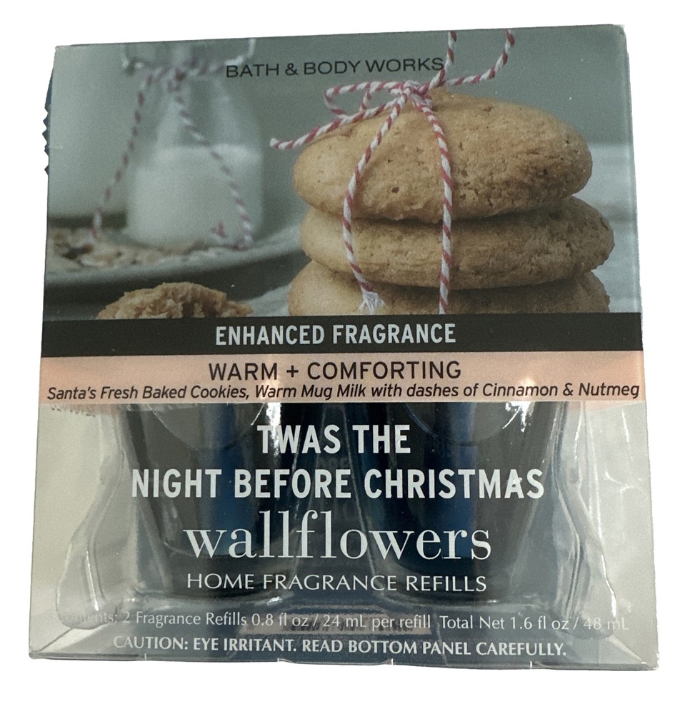 Occasion: any occasion gtin13: 0667559068051 Brand: Bath & Body Works Smart Home Compatibility: Wallflowers Plug In Diffuser Model: Twas The Night Before Christmas Power Source: Wall Plug-In Volume: 1.6 fl oz UPC: 0667559068051 Form: Oil Room: Any Room Number in Pack: 2 Size: 1.6 fl oz Intended Use: Deodorizer Theme: Warm And Comforting Scent: Twas The Night Before Christmas Department: Adults Features: Deodorizer, Odor Eliminator Type: Refill MPN: Does Not Apply Effect: Boost Energy Levels Color: Assorted Style: Traditional Material: Glass Product Line: Wallflowers Installation Area: Wall Manufacturer: Bath & Body Works