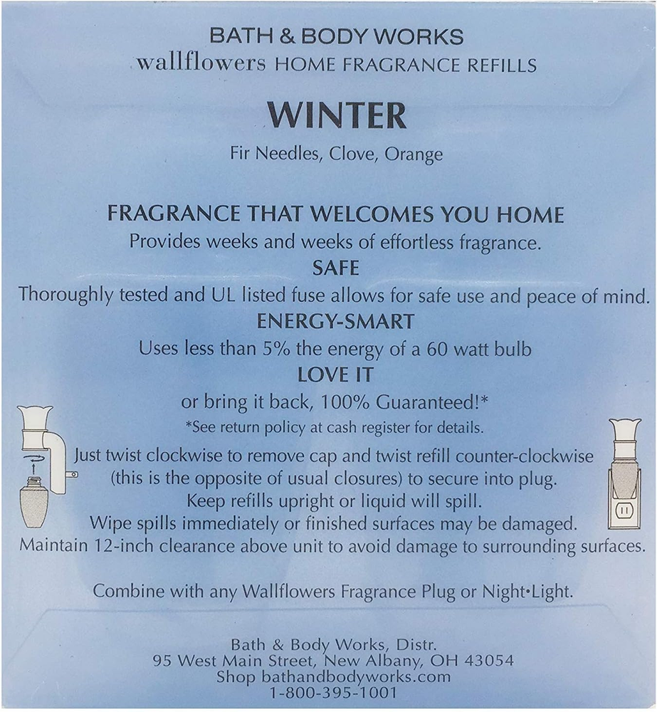 Bath and Body Works Winter Wallflower Refill 2 Bulbs Bath & Body Works Wallflower Refill Bulb 2 pack Scent: Winter One Bath & Body Works Winter Wallflower Home Fragrance Refill Bulb 2 pack- each bulb 0.8 fl oz each. Freshen the air in your home or office with this winter inspired scent. 2.6 inches x 6.7 inches x 2.1 inches. Weight: 6.4 oz Light Source Type bulb Item model number Invierno Style Modern Number of Items 2 Power Source Corded Electric Number of Light Sources 2 Theme Winter Fixture Type Non Removable Unit Count 1.0 Count Room Type Bedroom Assembly Required No Batteries required No Material Glass Installation Type wall-mount Is Discontinued By Manufacturer No Specific Uses For Product Home Indoor/Outdoor Usage Indoor Water Resistance Level Not Water Resistant Perfume Scented Item Weight 6.4 ounces Light fixture form Wall Mounting Type Wall Mount Voltage 1.2E+2 Volts Recommended Uses For Product Home fragrance" or "Air freshening Included Components Bulb" or "2 Bulbs Product Dimensions 6.7 x 2.6 x 2.1 inches