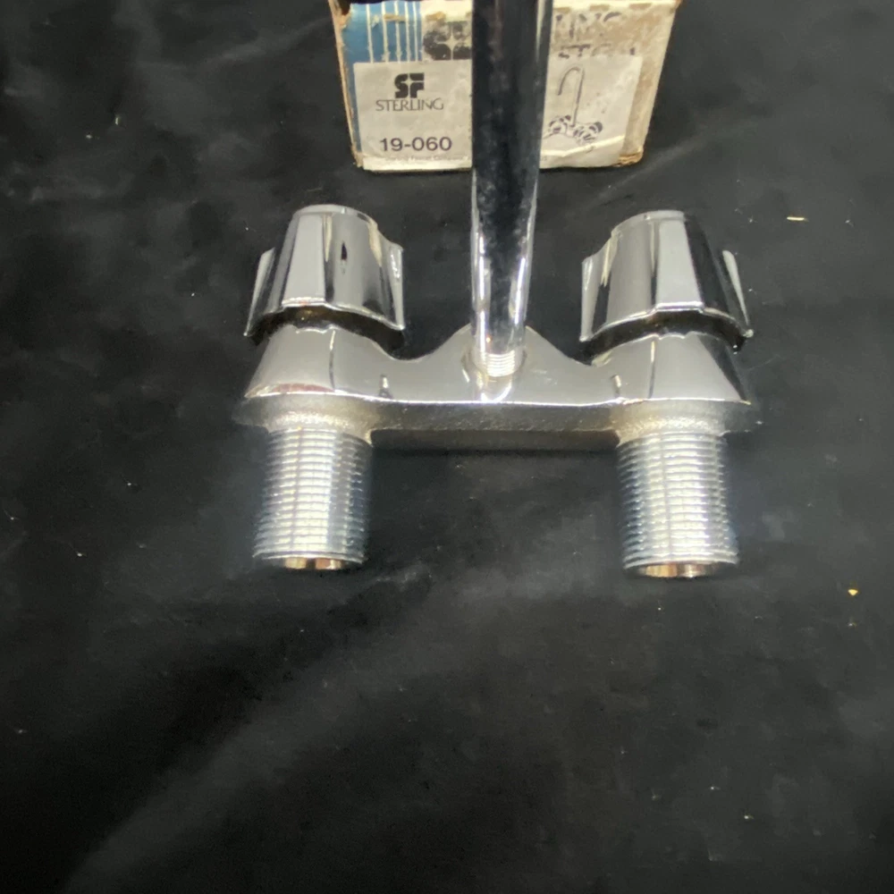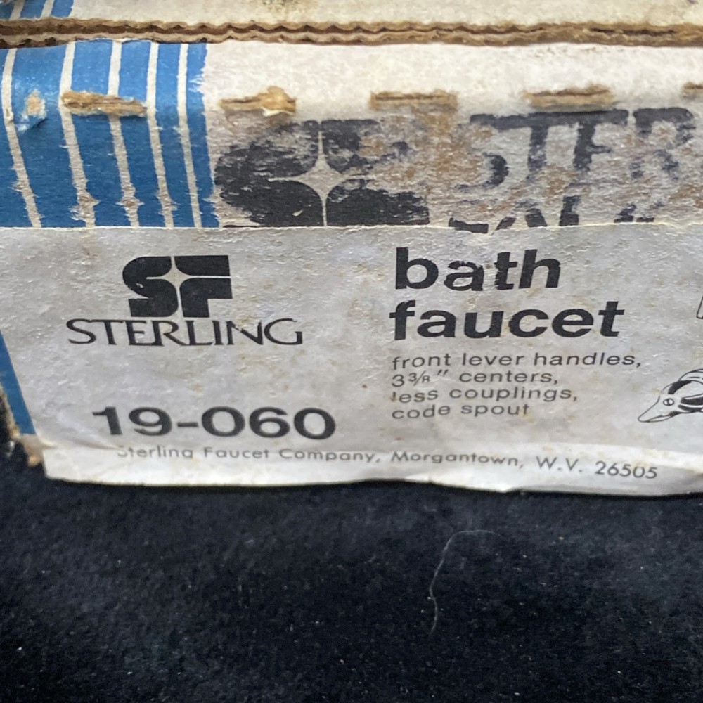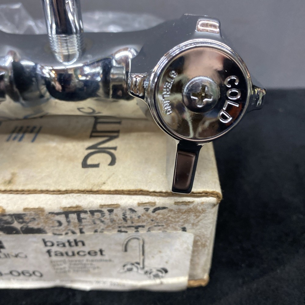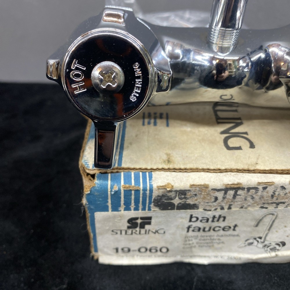 The Sterling Bath Faucet is a vintage, never-used piece with front lever handles and a polished chrome finish. Made of brass with a 3 3/8 center spout, this bathroom faucet adds a touch of retro charm to any room. Perfect for homeowners looking to upgrade their bathroom with a classic and timeless design. In unused excellent condition. Box is damaged and worn.