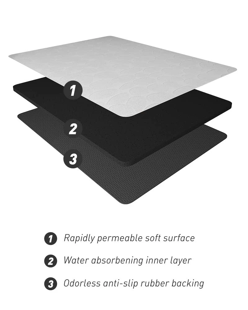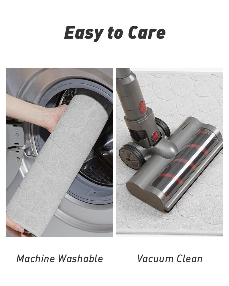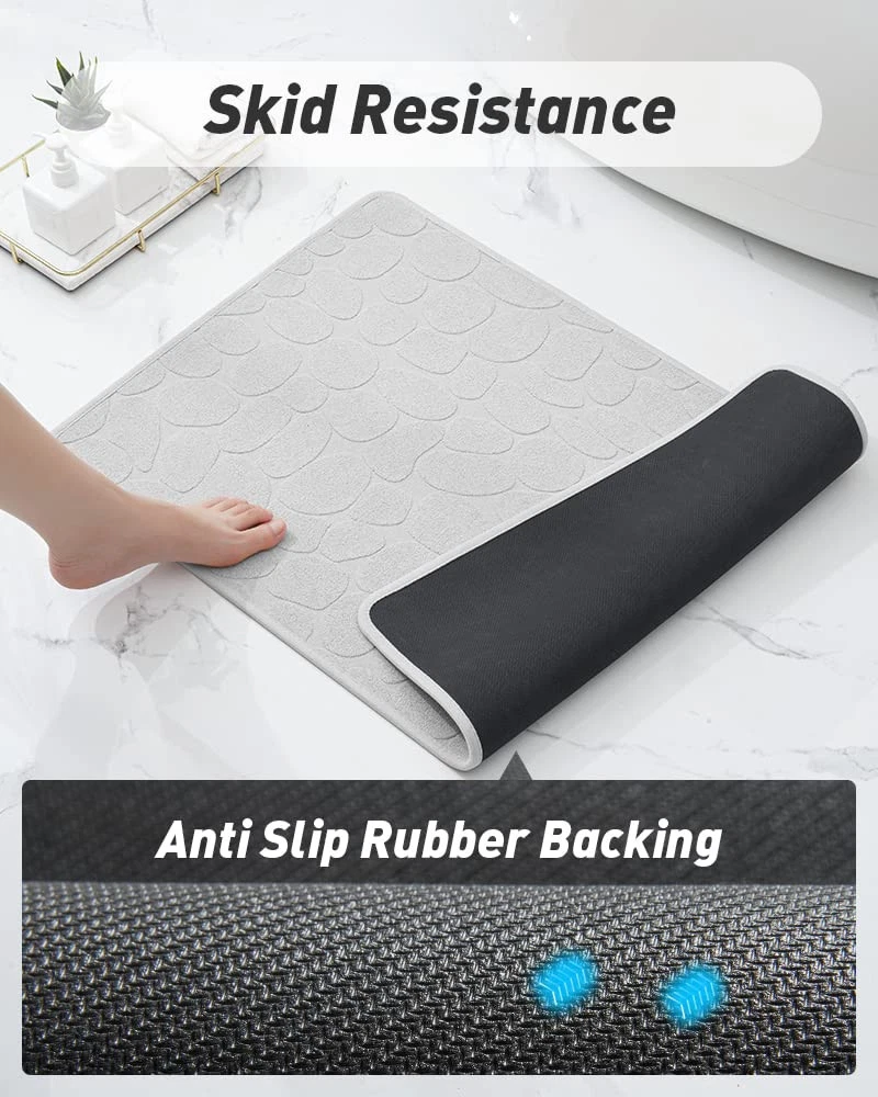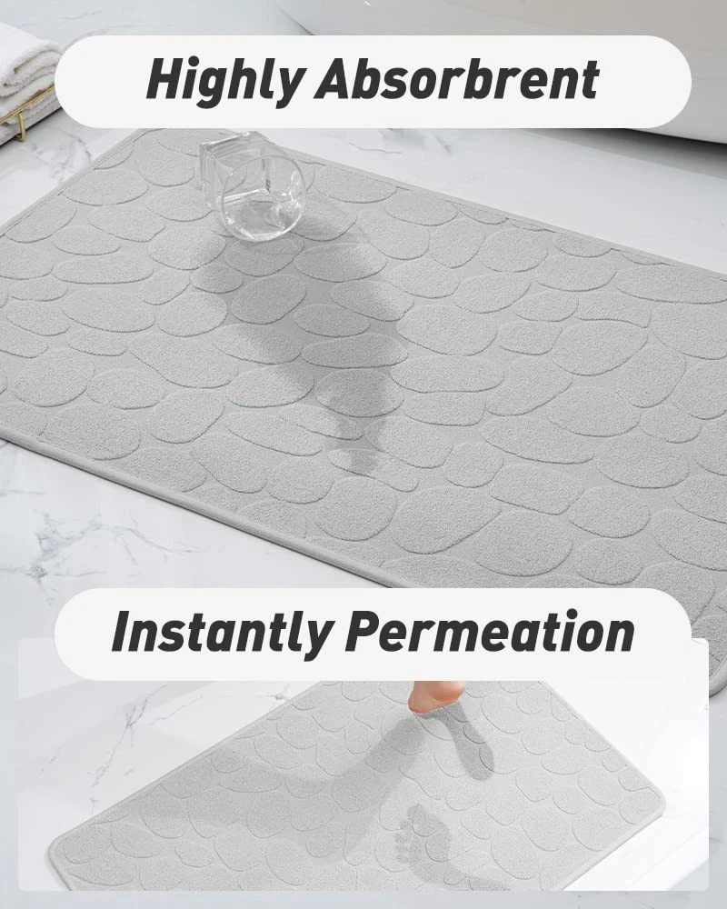 【Absorbent Cloth Top】The moment water pulls on the absorbent bath mat, it will be absorbent instantly without any drops stay on the surface, greatly reducing the possibility of accidently falling, water Absorption reaches 2 times of other fiber mats 【100% Odorless Non Slip Backing】Rubber backed bathroom rugs provide strong friction on wet slippery floors and prevent slipping and falling, especially for family with kids and elderlies, meanwhile, non slip bath mat prevents moisture from seeping into the floor and causing damage 【Thin Bath Mat】Our bathroom mat won’t get stuck under the door, 0.3 inches of thickness is perfect to stepping on, making the door easy to open and close, even in high traffic areas, the low pile bathroom rug won’t crumple and still fit tightly on the ground 【Machine Washable】Durable bath mats for bathroom floor can withstand multiple machine washes without falling apart, hang the bath mat to dry, the rubber back won’t crack 【Multi-Function Bath Rug】Soft cloth, keep you away from wet, ice cold bathroom floor, with an anti-slip rubber layer on the back of the super absorbing towels, our thin bathroom floor mat is both skid resistant and water absorbent