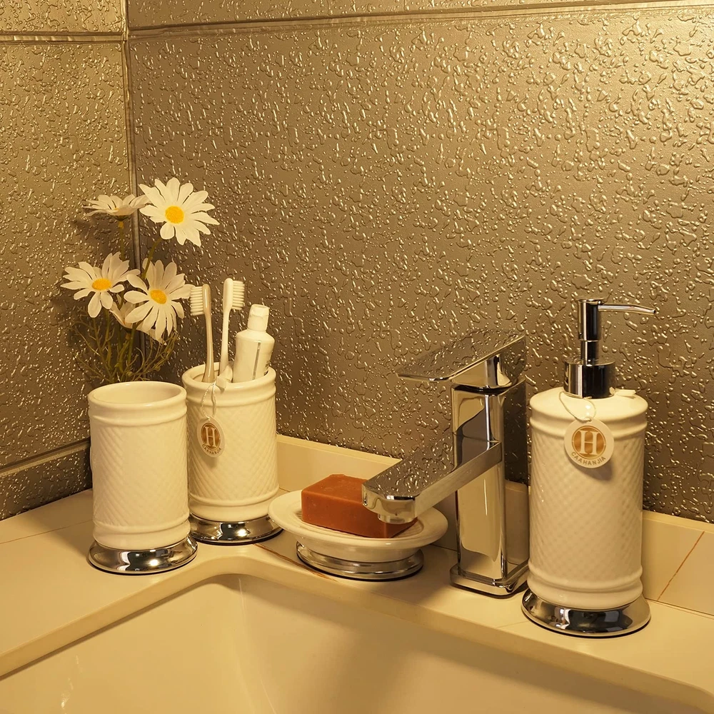 [Bathroom Set Material]: Ceramic bathroom accessories are made of high-quality porcelain clay and fired at high temperatures, which are safety, durable and easy-to-clean [Multi Functional]: Stylish design makes it ideal for modern bathrooms, this bathroom accessory set makes an attractive addition to any bathroom. It is suitable for homes, hotels, office buildings and other uses. [Bathroom Decoration Set]: Includes:1 lotion dispenser(ABS pump), 1 Toothbrush Holder, 1 tumbler cup, 1 soap dish [Great Gift]: As a perfect gift for your loved , family, friends and colleagues, it is the ideal choice for modern bathroom with its trendy design.