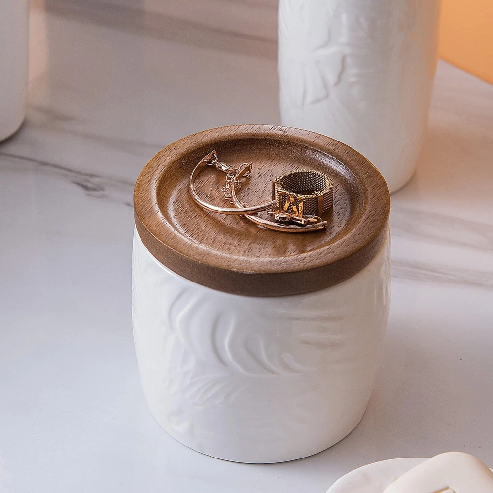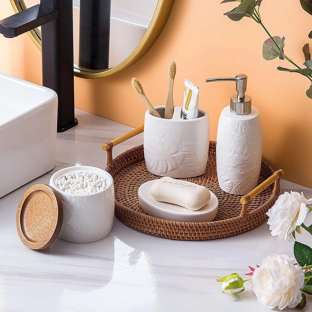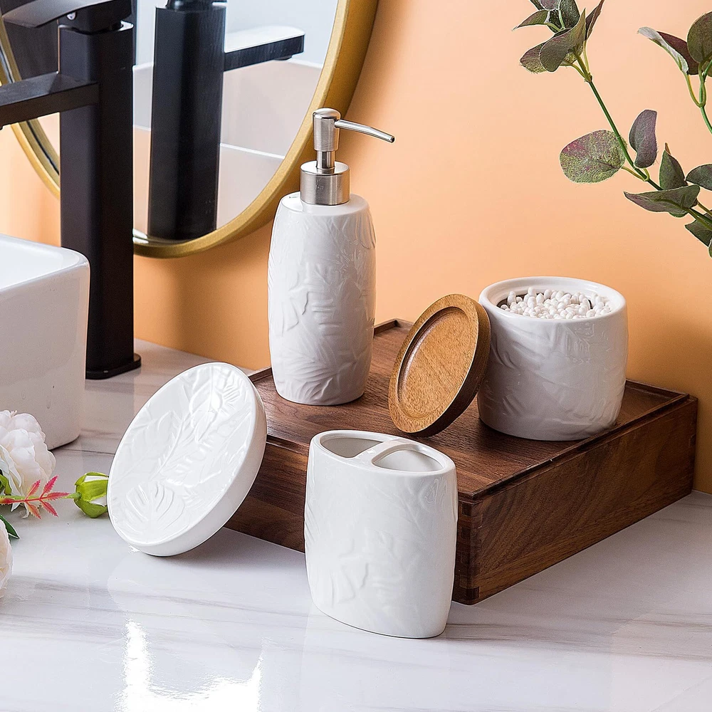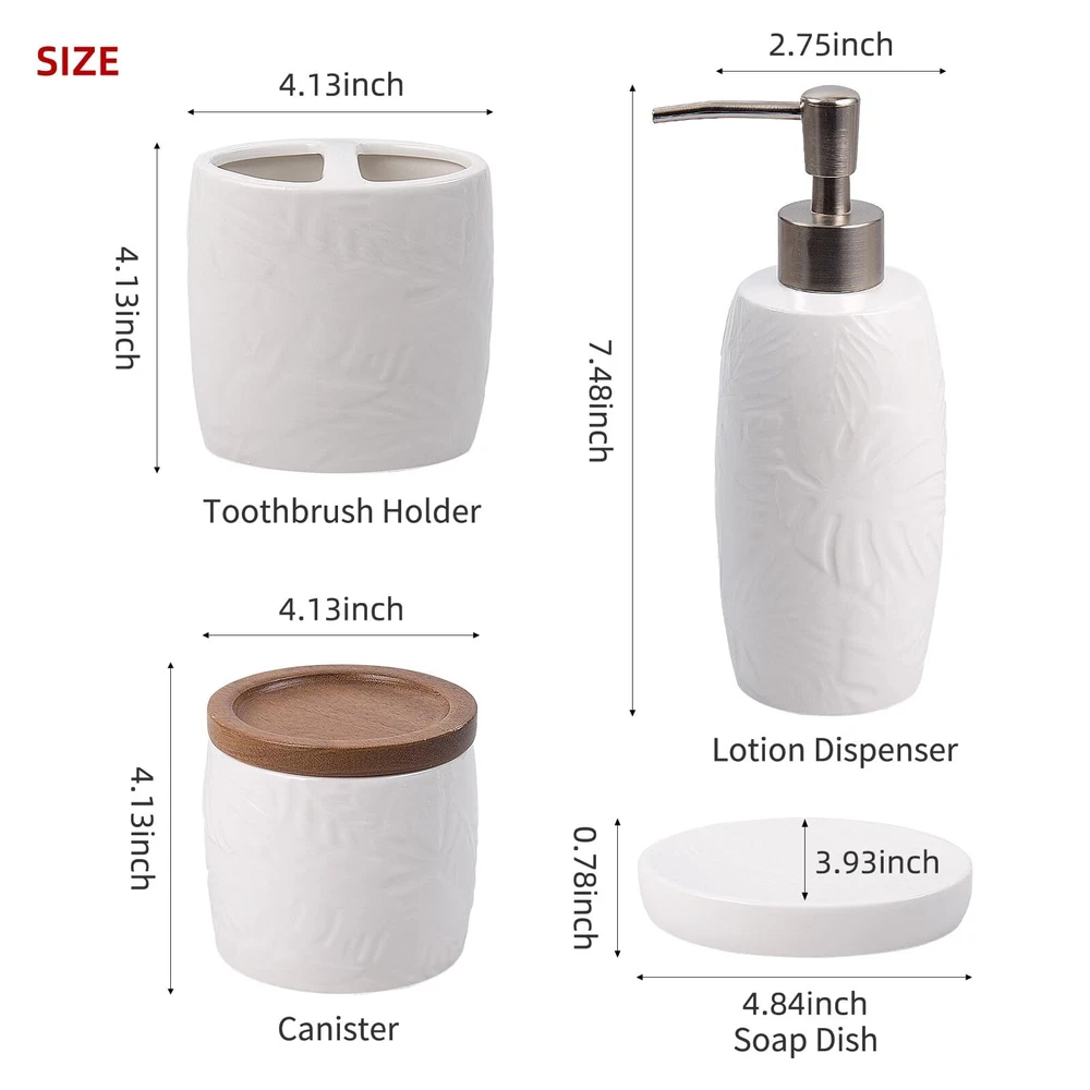 【4 Piece Bathroom Accessory Set】:Includes 1 x soap dispenser,1 x tumbler,1 x Cotton Jar, and 1 x soap dish. Organize and enhance your bathroom quickly and effortlessly. 【Embossed Designt】: The tropical leaves embossed design on a white ceramic body is unique and characteristic. The simple yet subtly decorative design could go well with various bathroom decoration styles. 【Large Cotton Jar】:Our apothecary jars with wood lids can decorate your powder room, bathroom vanity, makeup table, and more perfectly. It’s great for storing and organizing Q-tips, cotton balls, cotton swabs, cotton round pads, floss picks, hair timebands, makeup brushes, pens, clips, and more. 【Quality Soap Pump】:Our bathroom set accessories, exquisite fitting with a premium pump make it easy to squeeze out liquids, and fit tightly to prevent leakage. Also can prevent rust and last for a long time. 【High-Quality Ceramic Construction】: Each piece in this set is made from high-quality ceramic, ensuring durability, resistance to moisture, and a long-lasting finish that will maintain its beauty over time. leakage. Also can prevent rust and last for a long time. 【Easy to clean】:Wipe it with a soft cloth or just rinse it with water. The smooth surface feels nice to touch, there are no sharp or rough edges anywhere.