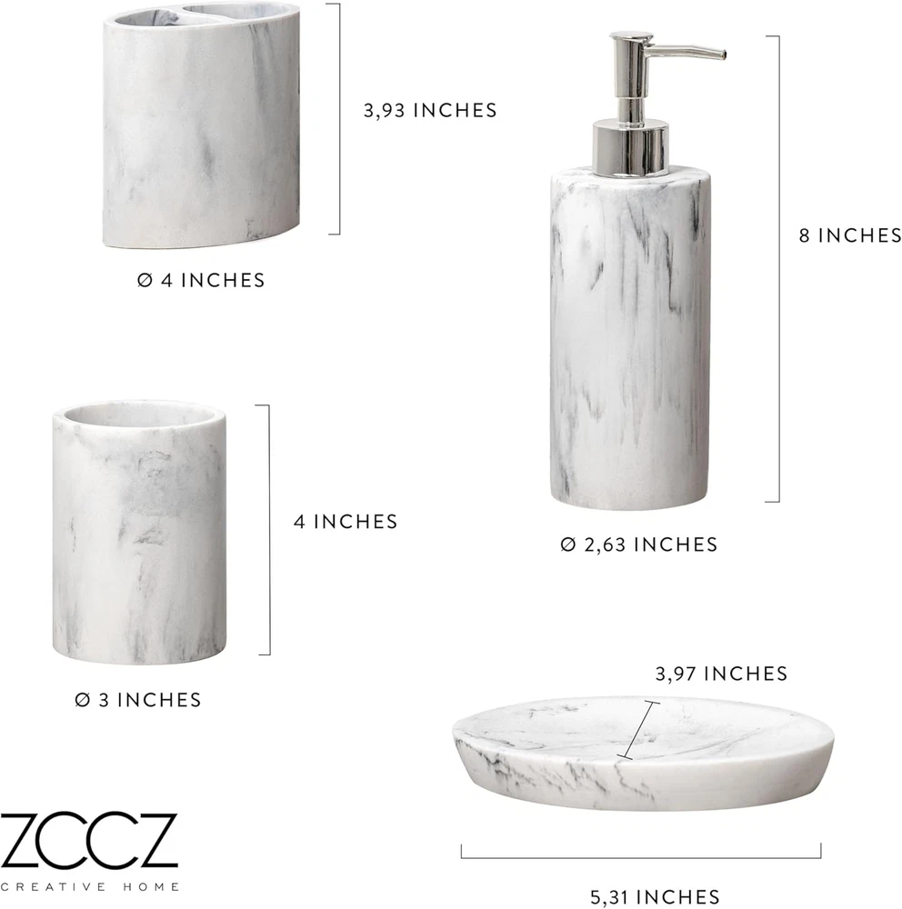 Bathroom Accessories Set 4 Piece: With 1 x soap dispenser, 1 x tooth brush holder, 1 x bathroom tumbler cup and 1 x soap dish; allow you to organize a lot of your bathroom stuff with easy and keep your bathroom clean, tidy and orderly Well Designed Bathroom Set: Classy Marble look, all of the items compliment each other. Our bathroom decor set matches your bathroom in a perfect manner Premium Material: The bathroom vanity countertop accessories set is made of nice resin material, not the brittle type of plastic or ceramics. It has that heaviness and not heavy weight marble. Pretty sturdy, the bathroom sink set won't break easily Great Gift Idea: The bathroom set accessories were well-packed to ensure that they arrived safely without damage. Perfect gift for your families, friends, lover, colleagues, housewarming or a wedding 100% Satisfaction Guarantee: Include 1 x Bathroom Accessories Set (4 piece set), 45-day money back guarantee, worry-free 18-month warranty, and friendly customer service. zccz modern bathroom accessories set, 4-piece marble pattern bath vanity accessories set with soap dispenser, toothbrush holder, tumbler and soap dish Features Nice design, classy marble look, the bathroom decorations accessories bring bright and elegant tough to your whole bathroom. Well crafted, the bathroom essential tie the colors and design together perfectly, go well with bath decor. Quality resin material, heavy and nice, the marble bathroom set doesn't break easily . A good idea to give the bathroom sets complete to your families, friends or colleagues as a gift. After Sales Your satisfaction is our goal of service. Any Problems, please do not hesitate to contact us. STEP: Your account > Your order > Purchased Items > Seller: ZCCZ > Ask a question.