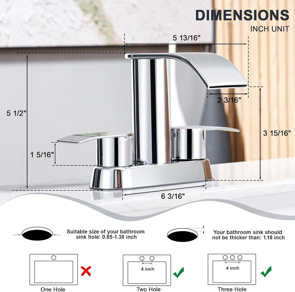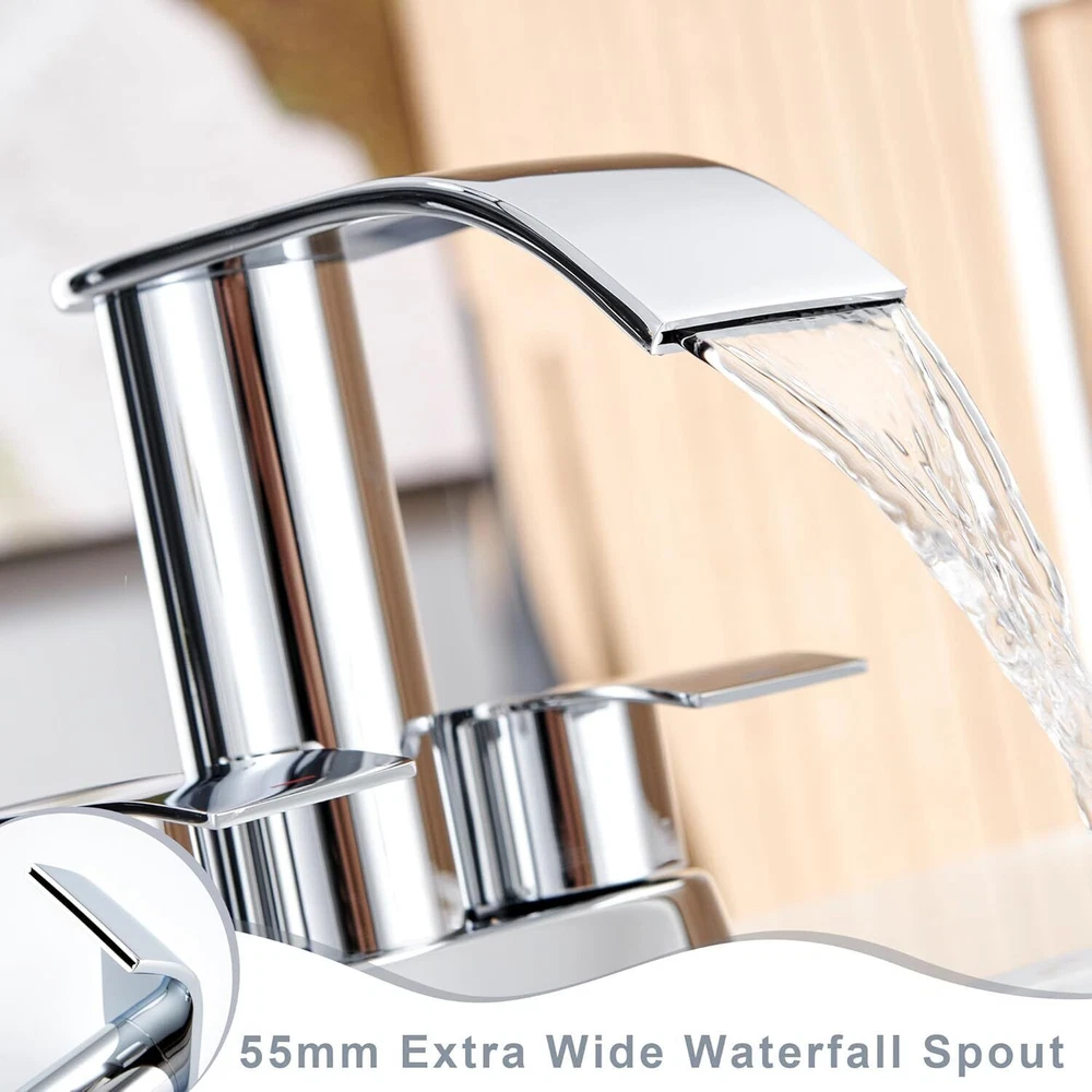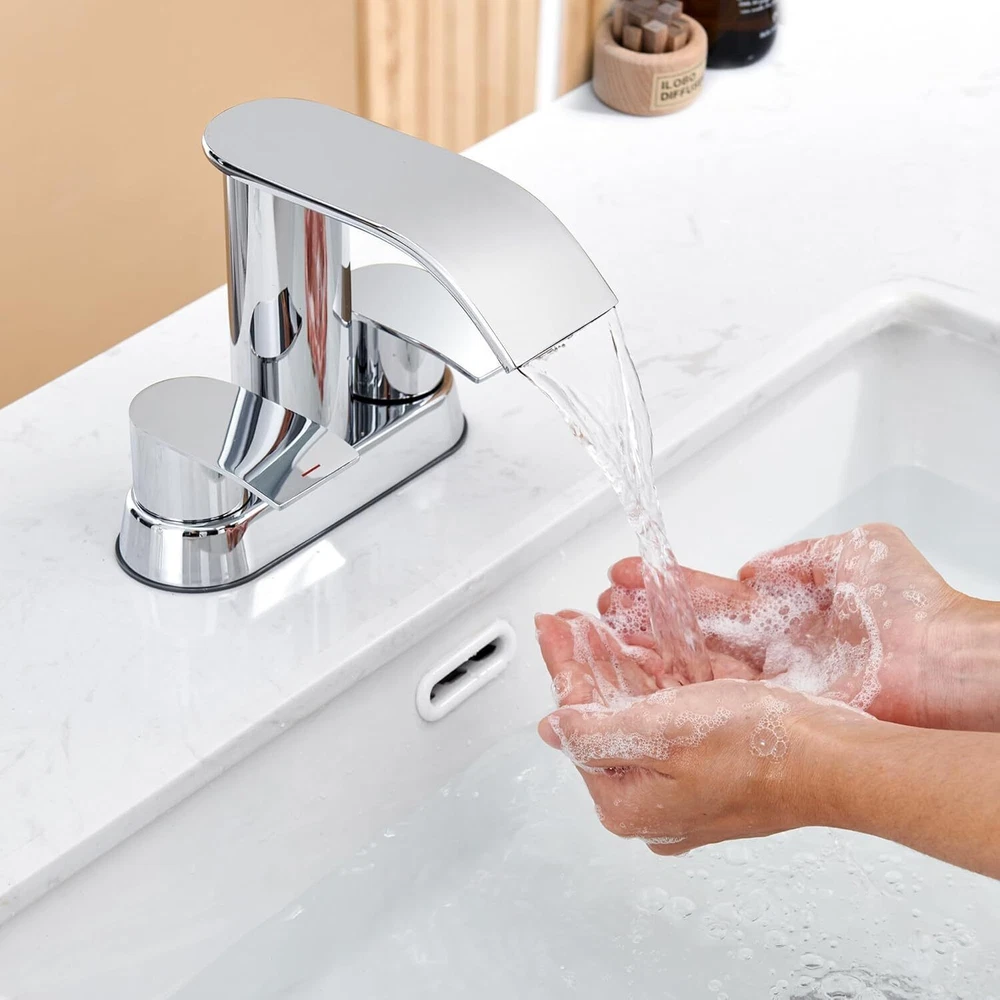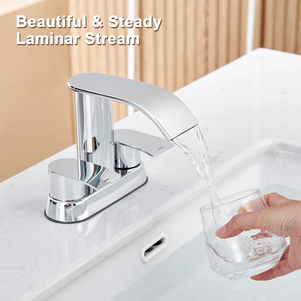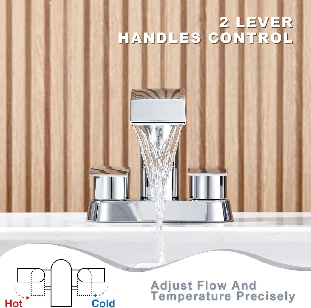Recommended Uses For Product Kitchen Mounting Type Deck Mount Finish Type Chrome Material Stainless Steel Color Chrome Number of Handles 2 Included Components Drain Hole Count 2 Special Feature Easy to Install See less About this item HIGH QUALITY: The patented waterfall bathroom faucet is designed originally by our own designers and constructed from high quality SUS304 Stainless Steel, sturdy and durable, which makes this faucet unique and durable. And it have registered with the CEC. You can use it in bathroom, powder room, RV, farmhouse, travel trailer, apartment,laundry room, rental houses, and restroom counter sink. MODERN STYLE: The unique faucet has sleek body line, the fashionable waterfall spout, the elegant knob and the visual-pleasing waterfall Water ,Which add luster to your bathroom and make your home looks more advanced and modern. EASY TO USE: It is very easy to install and the smooth surface makes it easier to clean. The anti-fingerprint feature also makes sure that it always keeps it clean and tidy. COME WITH A FREE POP UP DRAIN: We provide a sturdy and durable metal pop up sink drain stopper, which fits perfectly with this basin faucet. Recommended Uses For Product Kitchen Mounting Type Deck Mount Finish Type Chrome Material Stainless Steel Color Chrome Number of Handles 2 Included Components Drain Hole Count 2 Special Feature Easy to Install Handle Type Knob Style Waterfall Installation Type ['Two Holes', 'Three Holes'] Maximum Flow Rate 1.5 Gallons Per Minute Model Name DJS-MP-PB-C-A Handle Material Stainless Steel Spout Height 3.94 Inches Item Weight 3.3 Pounds Handle Location Center Spout Design Waterfall Is Electric No