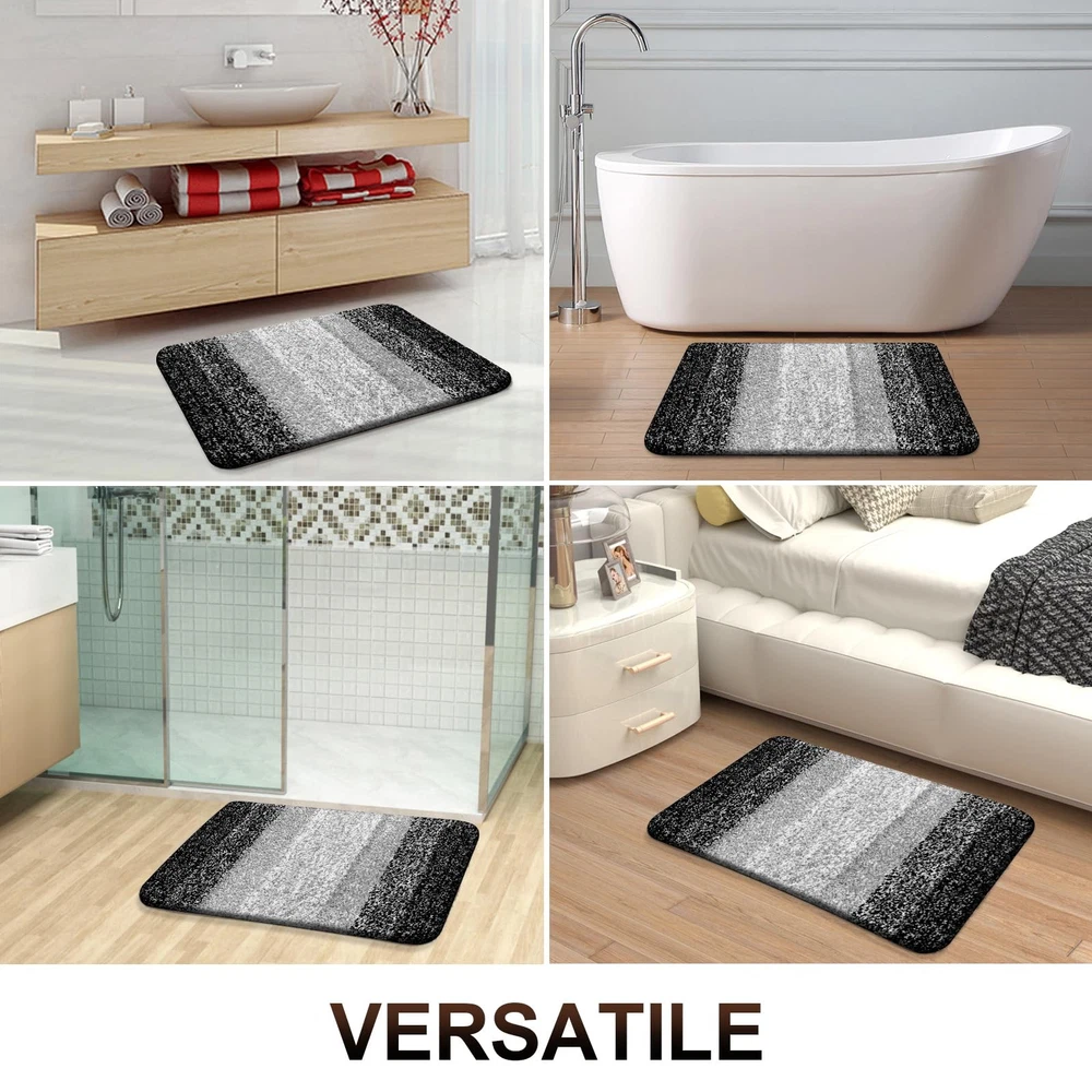 CREATE YOUR BATHROOM OASIS We are dedicated to bringing our customers premium and functional household products at reasonable prices. Our vision is to continuously innovate and improve our products based on customer needs as well as current industry trends. With many different color and sizes to choose from, you will easily find rugs to coordinate with your decor! FEATURES: - 1 inches high density microfibers, very soft and comfortable for your feet to step on, plush to the touch. Unique gradient color stripe design - TP Rubber backing - Ultra absorbent - 100% machine washable TAKE A LOOK AT SOME QUESTIONS FROM OUR VALUED CUSTOMERS: ☛ IS THIS RUG STURDY AND LONG-LASTING? Our bath rug is constructed of the most premium, high-quality TP Rubber backing. This sturdy and strong material will help to keep your bath rug secure on your floor so you no longer need to worry about shifting or bunching. ☛ CAN I REALLY MACHINE WASH AND DRY THIS RUG? YES! We know bath rugs need to be cleaned often. That’s why we’ve made it simple for you. Our bath rugs can conveniently be thrown in any washing machine. For best results, lightly tumble dry. ☛ MY OLD RUG WAS ROUGH AND SCRATCHY ON MY FEET HOW IS YOURS DIFFERENT? Good Question. Our bath rug features a soft, 1.18 inches shag soft microfiber fabric that is a pleasure to step on after a bath or shower. The density of our piles is much higher than most other mats on the market. ☛ WILL THE RUG COMPLEMENT MY BATHROOM DECOR? Certainly! Our bath rug comes in an assortment of stylish, sophisticated colors that will be the perfect complement to any bathroom design or existing towels. You can also use this rug in multiple areas of your home such as your bedroom, laundry room, playroom, children’s room, or pet space. [Luxuriate in Pure Comfort] Indulge your feet in the softest, coziest microfiber imaginable. With its plush pile, nearly one inch thick, our bath mat soothes and warms your feet, protecting them from the cold floor below. Enhance your bathroom decor with 's captivating bath mat. The gradient color stripe design seamlessly merges stripes, creating an eye-catching pattern that infuses sophistication into your space. [Ultra-Absorbent and Quick-Drying] Our bath mat features a soft shaggy microfiber fabric that absorbs water as you step out of the bath, shower, or while getting ready by the sink. The mat's deep pile efficiently traps moisture, allowing it to dry quickly and keep your rug clean and dry. [Long-lasting and Sturdy] Unlike other brands that use PVC or hot glue, we've built ours with a resilient TP rubber backing. While PVC and hot glue weaken over time, our TP rubber mats are designed to withstand repeated washing and drying. WARNING: Water under the bathroom rug can cause it to slip. Keep bottom of the bath rug dry! [Easy to Clean & Care] Our bathroom mats are machine washable for simple upkeep when needed. Wash them in cold water on a gentle cycle, without using chlorine or bleach. For best results, tumble dry on low heat or air dry. To maintain the color and texture, avoid frequent machine washing. [Matching Collection, Beautiful Décor & Versatile] Elevate your bathroom decor with our elegant gradient color stripe mats, ideal for sinks, showers, and beyond. Coordinate with matching toilet lid covers and contour rugs for added warmth and style. Complete the ensemble with our complementing shower curtains. Perfect for enhancing your own space with sophistication.