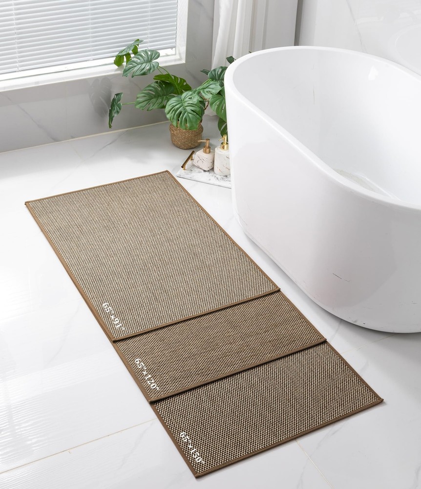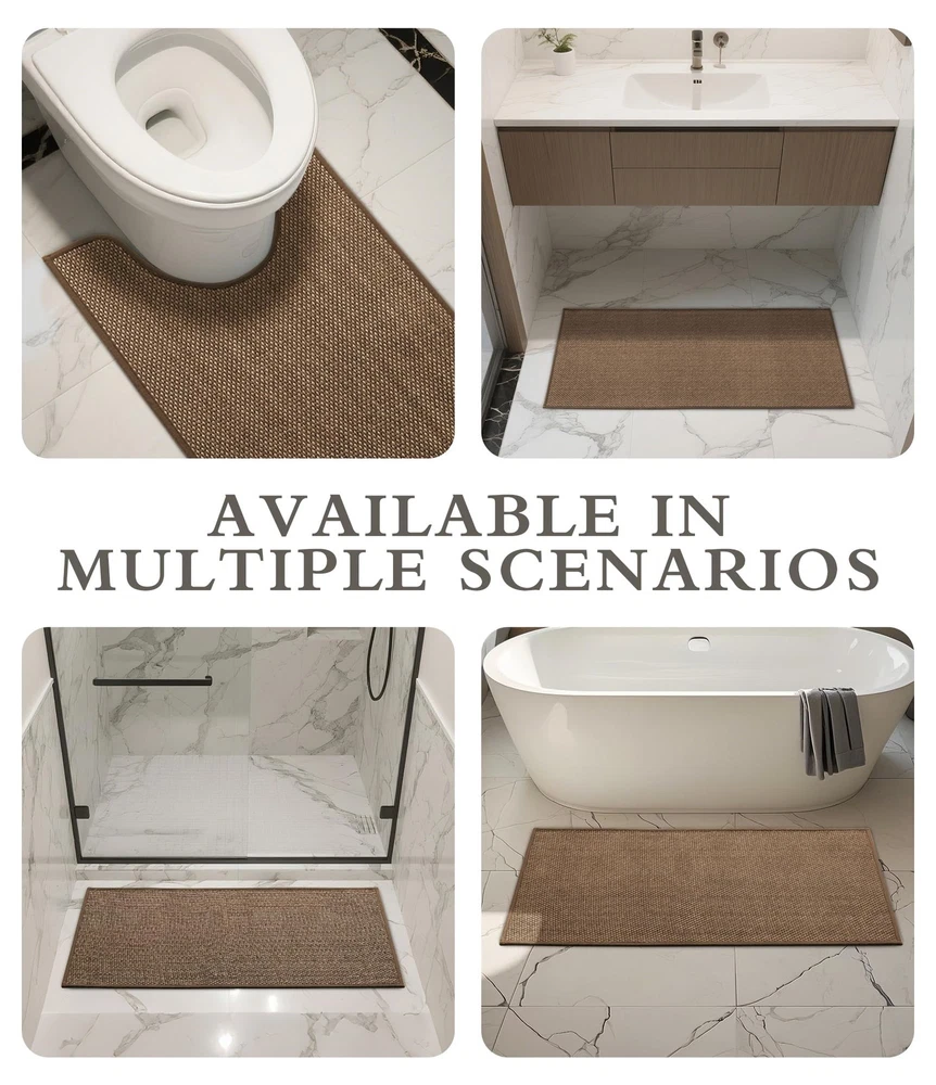 Bathroom Rugs Mat 25x36- Large Brown Non Slip Bath Mat Quick Dry Absorbent, Thin Bathroom Rugs Fit Under Door, Neutral Easy Jute Brown 25"x36" Bathroom Rugs Mat: This bath mat is made of soft easy jute material, retaining linen's beauty while improving slip resistance. It enhances bathroom decor with its natural charm. Bathroom Mat Quick Dry: This bath mat is made of ultra-thin and absorbent material, dries quickly after absorbing water. Its lightweight and compact design helps keep the bathroom floor dry. Non Slip Bath Mat : The non-slip rubber backing of the bath mat firmly grips ceramic and wooden floors, ensuring stability and safety in wet areas. Easy to Clean: The bath mat absorbs water and dries quickly when aired. Surface hair and dirt can be easily swept off or rinsed away. Thin Bathroom Rugs Fit Under Door : This ultra-thin bathroom mat fits perfectly under doors, preventing water from spreading and ensuring smooth door closure.