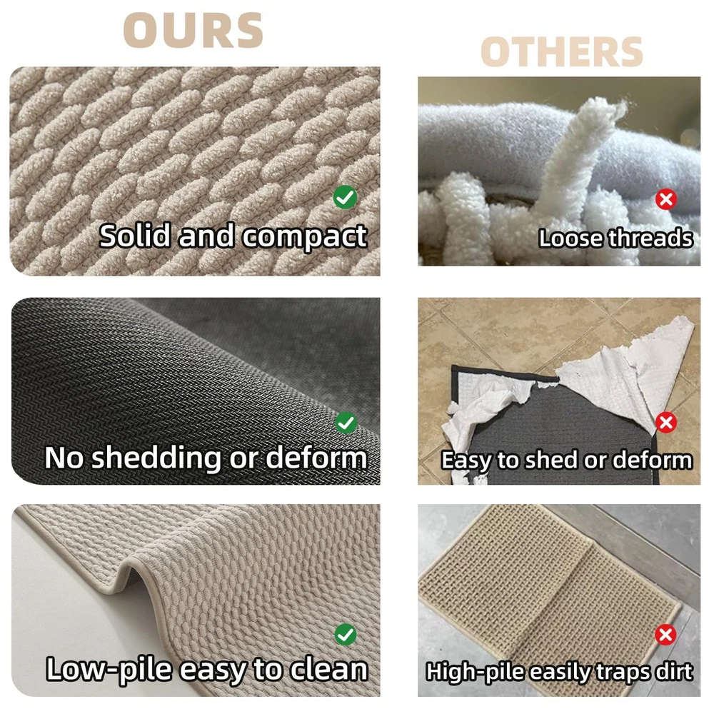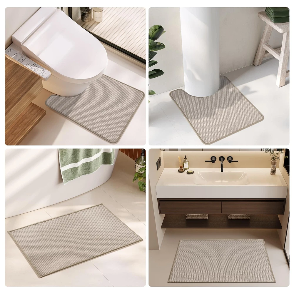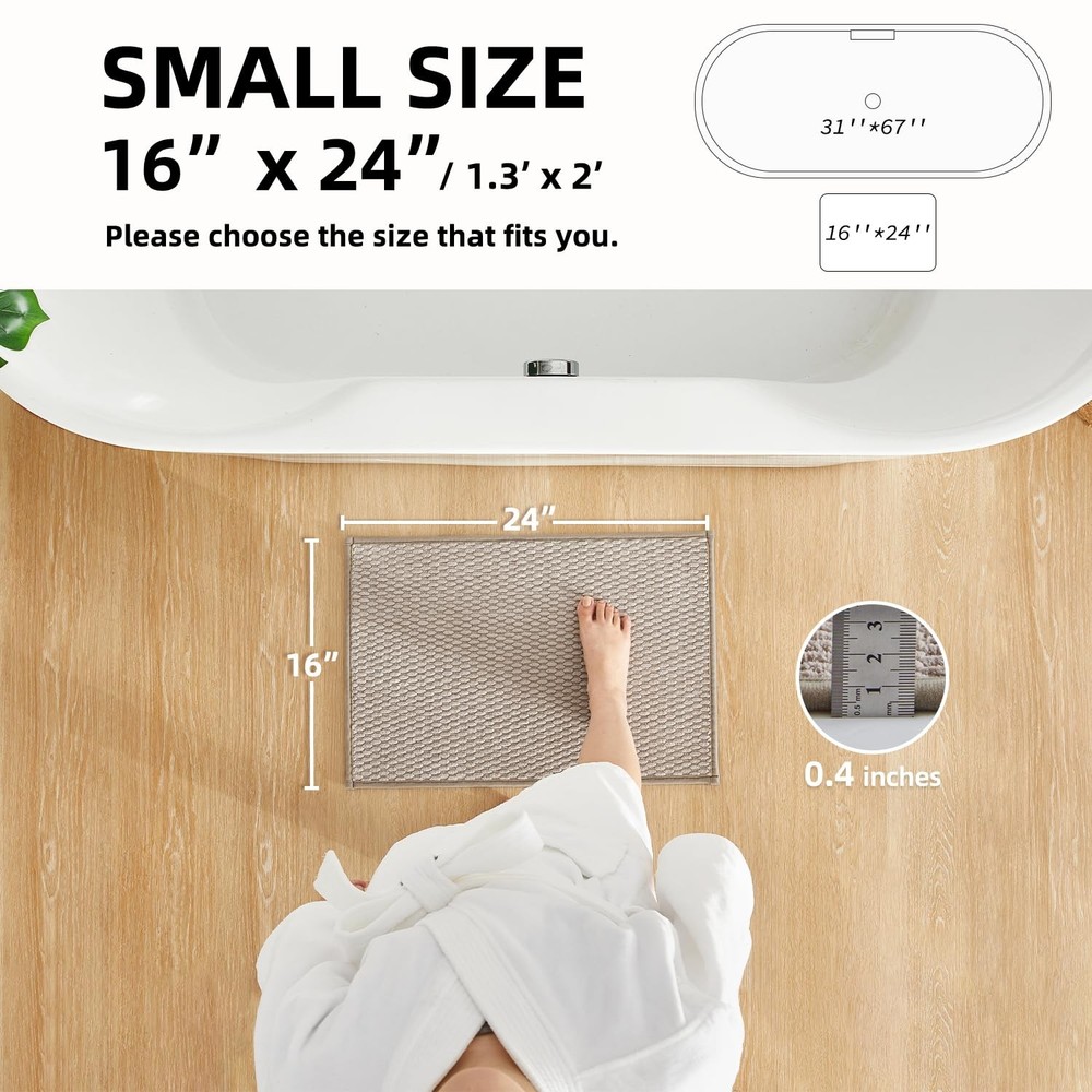 Transform your bathroom into a spa-like retreat with our bathroom rugs non slip washable. Crafted with a low pile woven design, this nonslip bath mat offers exceptional softness and comfort underfoot. Step out of the shower and experience its super absorbent material, which quickly soaks up water while drying fast in open air, keeping your bathroom fresh and dry. Designed for safety, our upgraded non-slip backing features natural rubber, ensuring a secure grip on smooth surfaces to prevent slips—perfect for kids and the elderly. Cleaning is effortless! Unlike high-pile mats that trap dirt, our rug is machine washable, durable, and resistant to shedding or deformation. With multiple colors and sizes available, this shower mat outside shower fits various spaces—bathroom, laundry room, kitchen, RV, and more! Indulge Yourself in Pure Luxury: Our bathroom rugs feature a low-pile woven design for a perfect blend of style and comfort. Step onto our soft bath rug after your shower and experience unmatched coziness. With this elegant woven bath rug, you can transform your space into a spa-like oasis Super Absorbent and Quick Dry: Our bath rug is super absorbent. When you step out of the bathtub or shower, it quickly soaks up the dripping water from your feet. And our fabric technique allows the rug to dry fast in the open air, bring you a dry and comfortable bathroom Upgraded Non-Slip Backing: Our bathroom mats feature natural rubber backing, increasing slip resistance of a floor surface. They tightly grip smooth surfaces without skidding, and hence prevent and reduce the risk of falls for kids and the elderly. Say goodbye to slippery PVC/TPR bathroom mat—step out safely with our secure, stable design Easy to Clean: Unlike high pile chenille bath mats that easily trap dirt, our bath mat design is easier to clean. Machine washable and more durable. Not easy to shed or deform, as its backing and surface come with unibody design. Please do not bleach or tumble dry Multi-Purpose Use: Available in many colors, these bath rugs can go with different kinds of decor style. Having lots of sizes to choose from, such as small bath rug, large bath rug,long bath rug and bathroom runner rug, you can easily find one to fit in front of the sinks, showers, or bathtubs. You can also use it in laundry room, bedroom, kitchen, or use as RV bath mat and more