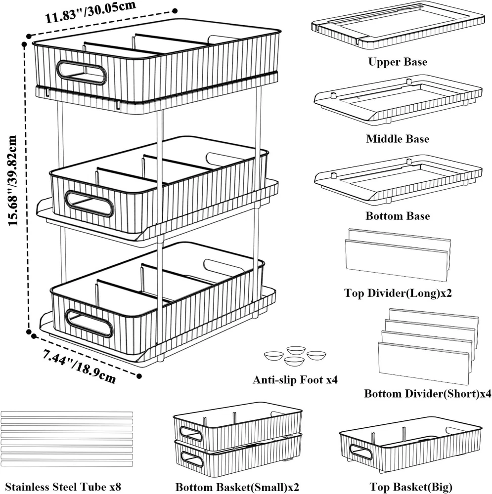 Bathroom Vanity Countertop Organizer: 3-Tier 7.4" x 11.8" x 15.7", Clear Description Features: Efficient Storage Solution: This Bathroom Countertop Organizer offer a convenient and space-saving solution for organizing your bathroom essentials. You can customize the compartments to fit different items, maximizing every inch of storage space Versatile Functionality: This multi-purpose organizer holds everything from cleaning supplies to toiletries. Its clear design is easy to see, so you can quickly find what you need without having to rummage through cluttered cabinets Easy Access and Retrieval: The pull-out feature of this 3-tier organizer ensures easy access to stored items. No more bending or reaching deep into cabinets. Simply slide out the organizer and grab what you need effortlessly, saving you time and effort Sturdy Construction: The bathroom tray is thickened PET materials, is built to last. The sturdy construction can withstand daily use and heavy items, ensuring long-lasting. Say goodbye to flimsy organizers that break easily Maximize Space: Easy Access Slide-Out Design for Quick Reach to Everyday Essentials With this pull out cabinet organizer. Utilize the often underutilized area under your sink and transform it into a well-organized storage space Product Details: Room Type: Bathroom Number of Shelves: 1 Special Feature: Drawer Style: Vintage Finish Type: Polished Brand: Fowooyeen Product Care Instructions: Wipe with Damp Cloth Size: 7.4" x 11.8" x 15.7" Assembly Required: Yes Recommended Uses For Product: Storage Number of Items: 1 Manufacturer: Fowooyeen Item Weight: 3.43 Pounds Furniture Finish: Stainless Steel Tube Installation Type: Countertop Specific Uses For Product: Cosmetics Unit Count: 1.0 Count Product Name: Storage Organizer Item Weight: 3.43 pounds Product Dimensions: 7.44 x 11.83 x 15.68 inches Country of Origin: China Color: Clear Finish: Polished Pattern: Solid Item Package Quantity: 1 Special Features: Drawer Batteries Included?: No Batteries Required?: No Room Type: Bathroom Number of Shelves: 1 Special Feature: Drawer Style: Vintage Finish Type: Polished Brand: Fowooyeen Product Care Instructions: Wipe with Damp Cloth Size: 7.4" x 11.8" x 15.7" Assembly Required: Yes Recommended Uses For Product: Storage MaterialMounting Type: PolyethyleneTabletop Mount Shelf TypeShape: Pull-Out ShelfRectangular Handling We will ship all orders within 3 business day of payment. Delivery We take pride in offering fast and reliable delivery for your orders! We are committed to getting your products to you as quickly as possible. Generally, we would like to inform you that all orders will be delivered to you within 1-3 business days after processing.However, in some cases, delivery times may vary depending on the buyer's location. Especially in remote or rural areas, the expected delivery time may be extended. In such situations, we do our best to ensure that your order reaches you as quickly as possible.If there are any delays, we will be happy to contact you to explain the situation. Our goal is to enhance your satisfaction with our fast delivery times. We work diligently to ensure that your order arrives safely.Trust us and enjoy our speedy delivery! Return Policy All items qualify for returns within 30 days of receipt. Buyer is responsible for return shipping on any item that is not damaged. Feedback We take our reputation seriously, we buy and sell online, so we understand the value of trust. If you are unsatisfied with your order, please contact us and we will work with you to resolve it to your satisfaction.