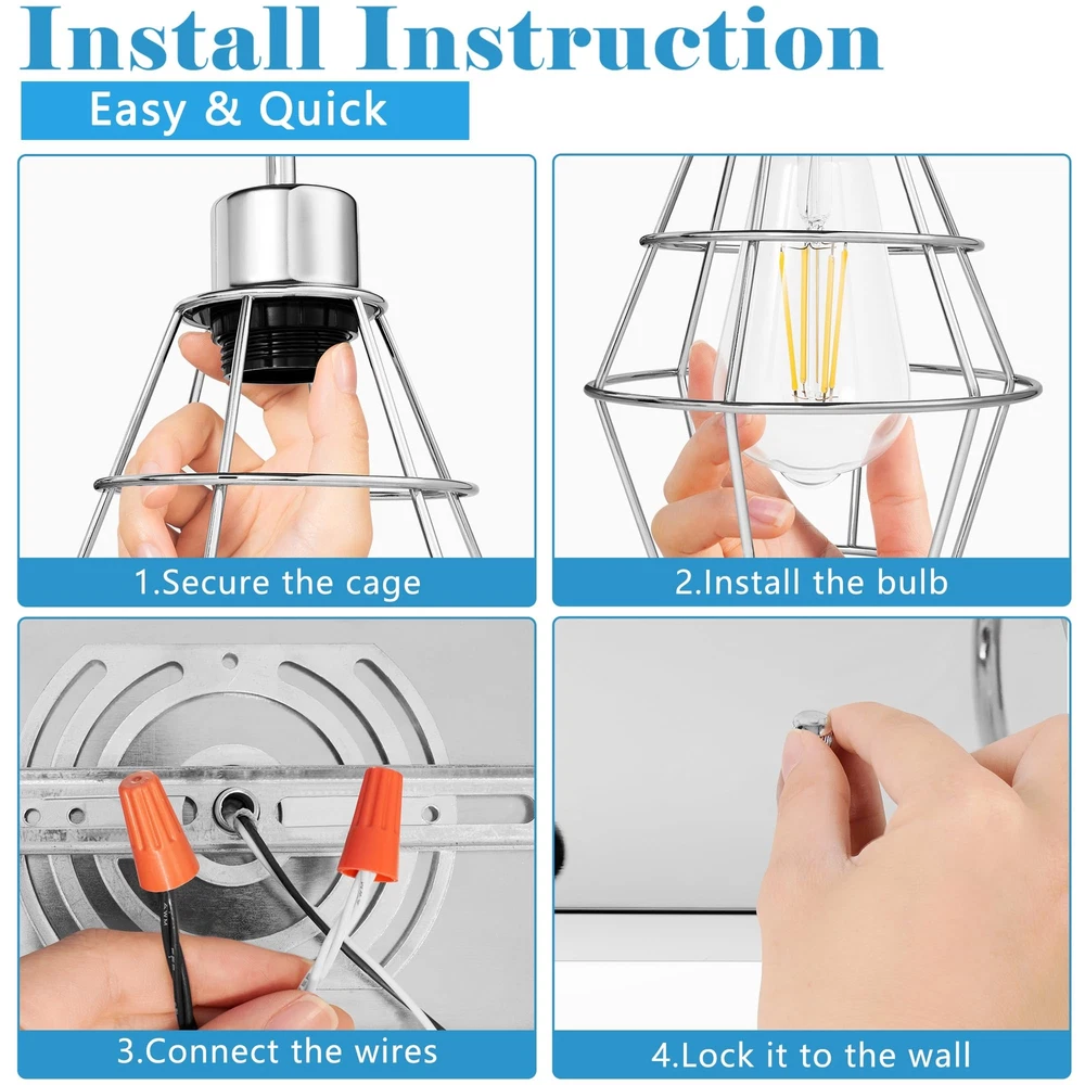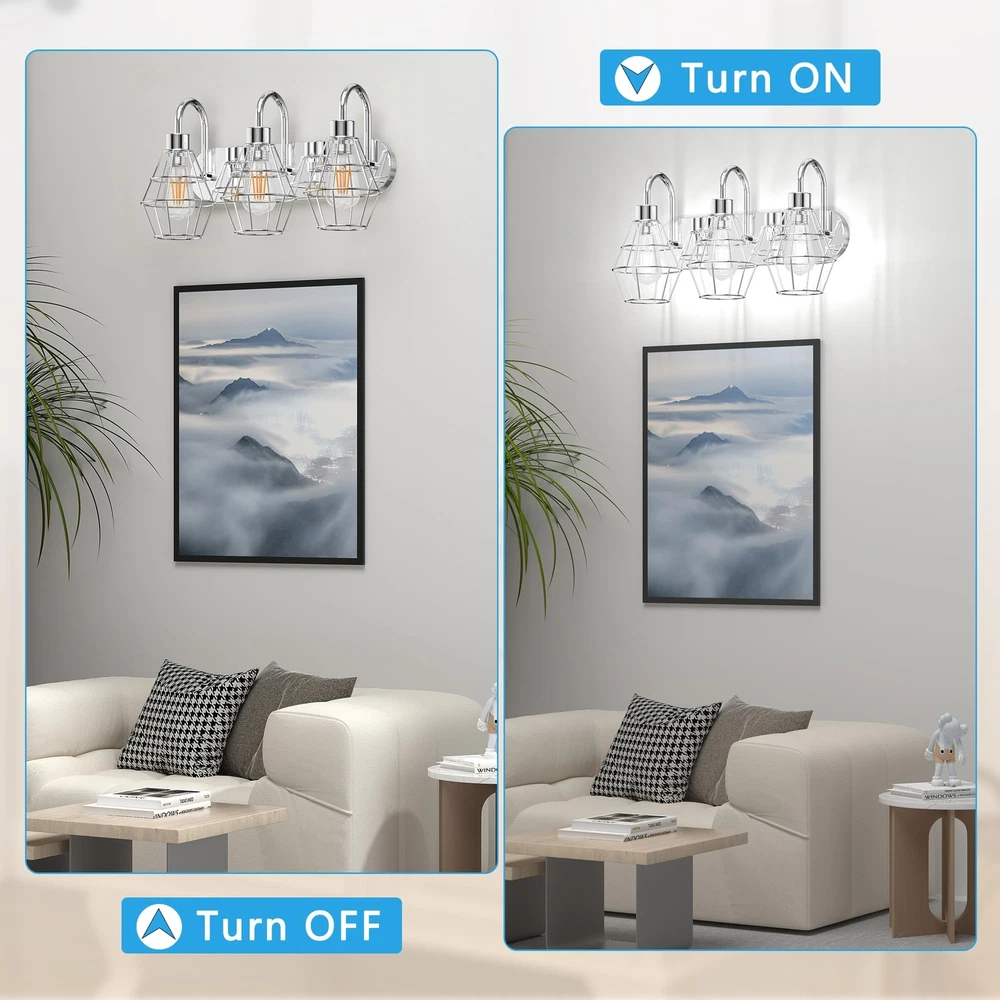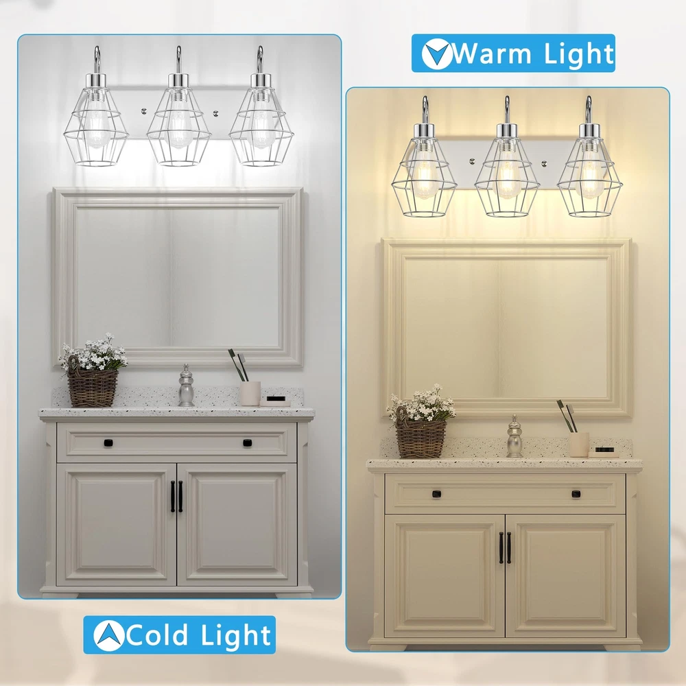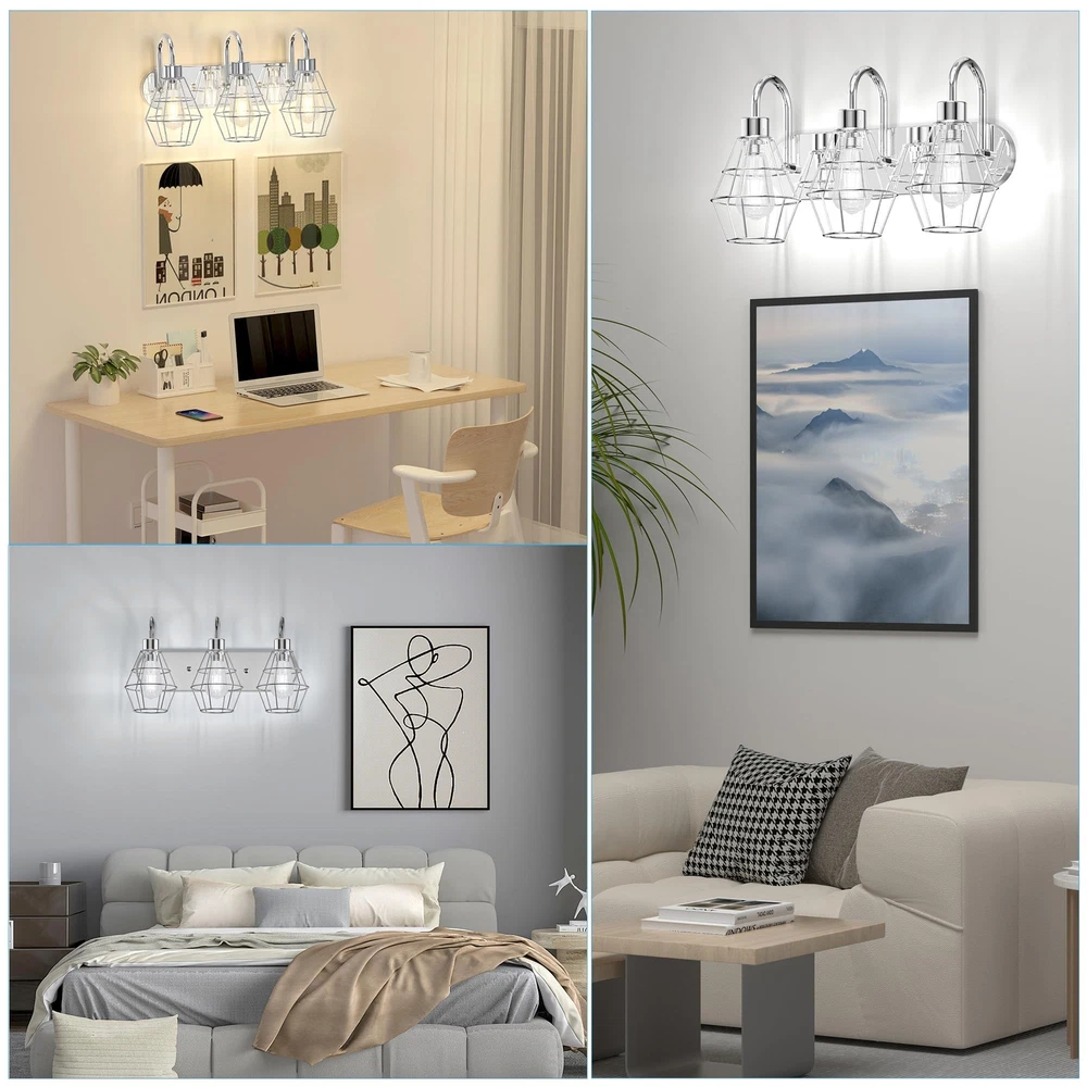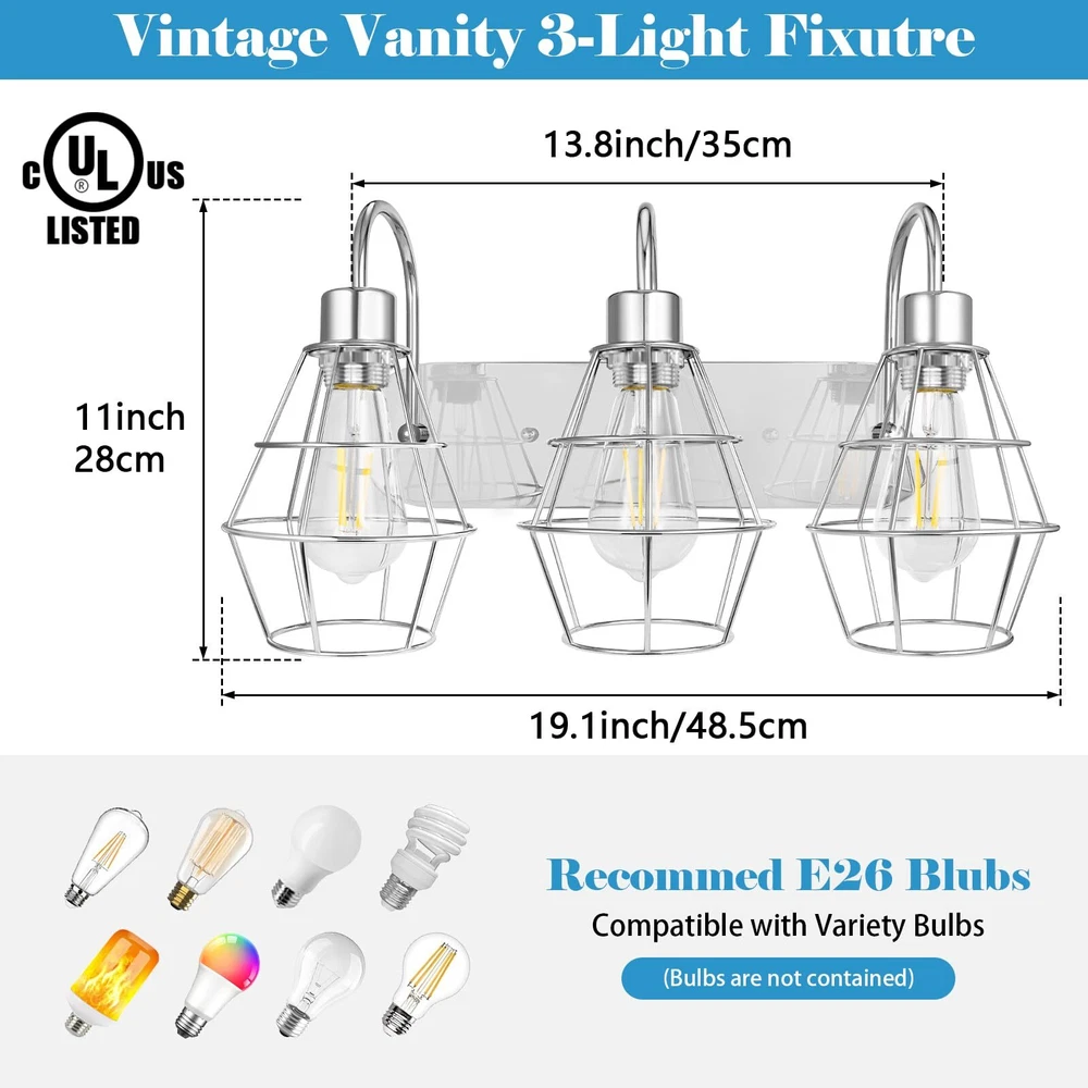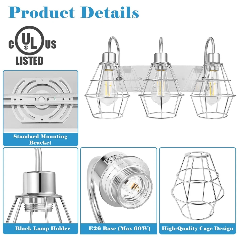 Style Industrial Bathroom Vanity Light Vintage Metal Cage Design: Add a touch of antique farmhouse charm to your space with this 3-light bathroom vanity fixture. The nickle brush cage design creates a unique appeal that's sure to impress. Premium Quality & Reliable: Made with high-quality metal, this wall light fixture is built to last. The strong bracket can bear heavy loads and won't deform over time, ensuring long-lasting stability and durability. E26 Medium Base Bulbs Required: with any E26 medium base bulbs(Max 60W each bulb), this industrial light fixture is perfect for creating a warm and inviting atmosphere. We recommend using Edison bulbs for a better style and bright, ample lighting.(Note: BULBS ARE NOT INCLUDED) Easy Installation and Wide Application: With all mounting hardware and a manual included, installation is quick and easy. This black vanity light is perfect for use in your bathroom, dressing table, mirror cabinets, living room, hallway, dining room, kitchen, room, and more. After-Sale Service: We're committed to providing you with high-quality products and excellent after-sales service. If you have any questions or suggestions, please get in touch with us. We'll do our best to help you solve any problems and ensure your satisfaction.