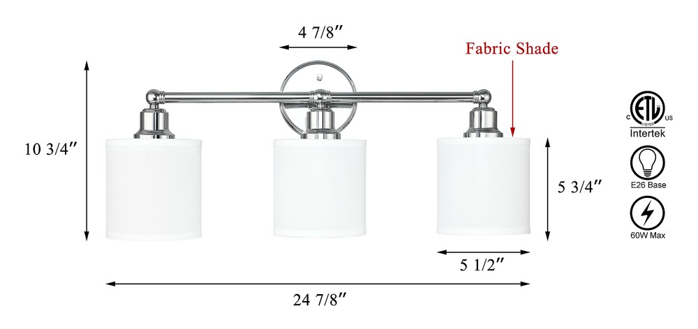 Our ETL certification is issued by Intertek Testing Services NA Inc. on 27-Oct.-2022 This 3 Light Wall light fixtures feature a circle backplate and drum shade in chrome finish. This bathroom vanity lighting can be mounted up or down. It pairs simply elegant hardware with a white fabric shade bringing an uncomplicated sophistication to bathrooms, bedrooms, corridors, entryways, kitchens, restaurants, dinning, and living areas. Suitable for Damp Locations. 3 light wall light with sturdy metal construction in chrome finish ensures it is highly durable and resistant to corrosion. Vanity light with white fabric shade brings a sense of purity and elegance, supplementing the sturdy metal base to form a harmonious integrity. Product Specification Dimension: W: 24-7/8" x H: 10-3/4" x D: 7" Finish: Chrome Shade Material: ‎White Fabric Shade Shade Dimensions: ‎W: 5-1/2" x H: 5-3/4" Socket: E26 Socket 3x60W (Bulb not Included) Compatible with Variety of Bulbs This wall light is suggest to use “A” Type Max. 3x60W bulbs for medium base (E26 socket) (incandescent bulb or equivalent CFL / LED bulbs) The fixture is dimmable when using the dimmable bulb with a compatible dimmer switch. Bulb & Dimmer Switch not Included. Vanity Light Collection XB-W220-3-CH Dimension W: 22" x H: 8-3/8" x D: 7" Finish Chrome Shade Material White Glass Shade Shade Diamension W: 4-7/8" x H: 5-1/4" Socket E26 Wattage 3 x 60W (Bulb not Included) XB-W1235-3-BN Dimension W:21-5/8"x H: 8-7/8"x D:6-5/8" Finish Brushed Nickel Shade Material White Glass Shade Shade Diamension W: 5-1/8" x H: 5-1/8" Socket E26 Wattage 3 x 60W (Bulb not Included) XB-W1294-3-BN Dimension W: 24-3/4" x H:10" x D: 6-1/4" Finish Brushed Nickel Shade Material Dual Glass Shade Diamension (Outer) W: 4-3/4" x H: 6-1/8" Socket E26 Wattage 3x60W (Bulb Not Included) Terms of Sale Shipping Policy: We ship within 1-2 business day from receipt of payment. We do not change your shipping address by email. Please make sure your address is correct before checking out and making payment. Payment Policy We accept most major credit cards, including, but not limited to, Visa, Mastercard, American Express, or Discover card and PayPal. All major credit cards are accepted through secure payment processor eBay Payment. All payment must be made within 7 days of the end of the auction. Otherwise, an "Unpaid Item Dispute" will be filed with eBay. Return Policy If you have any questions about purchases or concerns on our products or accessories replacement, please feel free to contact us through eBay's Message Center. However, if a return is required, please kindly noted that all returns should be met with following conditions: All return requests must be within 30 days of receipt. Return item must be in original condition as received (brand new in sealed package / with tags). Refund of purchase price less original shipping will be issued. Return postage is buyer's responsibility. Original shipping is not refundable for products features free shipping unless we're found at fault. We won't be able to refund if products are found damaged or used. Thank you. Any accessories (such as: Glass) broken via transportation can be replaced for free within 30 days receipt. However, If exceed the valid date to contact us that need you to pay for the accessories (such as: Glass), thanks!