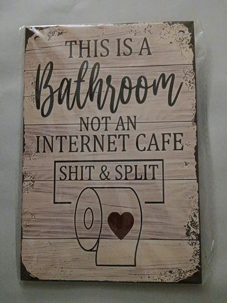 Add a touch of retro charm to your bathroom with this small, rectangular wooden plaque. The multicolor design features the phrase "This Is A Bathroom Not An Internet Cafe S..t & Split" in a fun, playful font. The plaque is easy to hang with its vertical orientation and lightweight construction. Perfect for any adult bathroom, this plaque is made of high-quality wood with a matte finish. It measures 8 inches in length and 5.5 inches in width, making it a great addition to small spaces. This handmade plaque is sure to add a unique touch to your home decor.