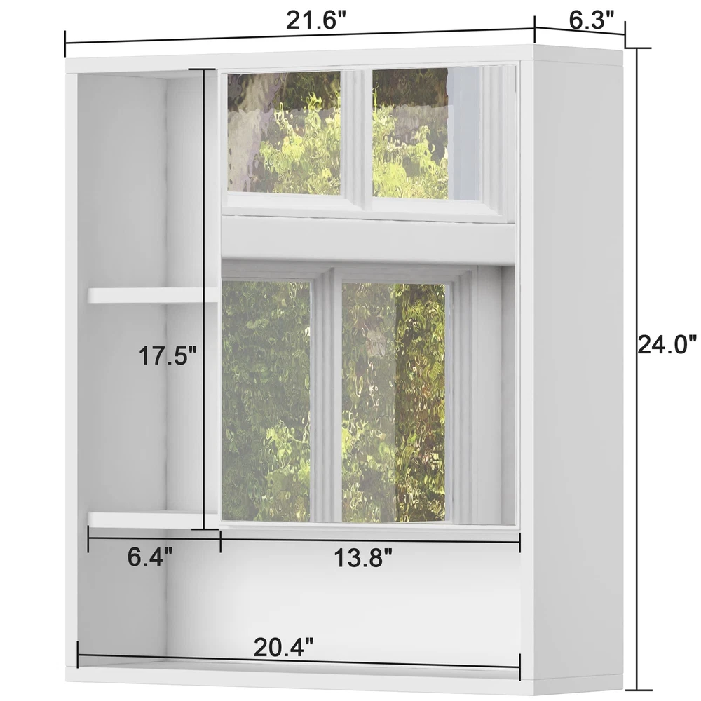 Bathroom Cabinet Wall with Single Mirror Door The frame of bathroom wall mounted cabinet is composed of asymmetrical, built-in, open shelving and its mirror with hidden hinges swings open to reveal one adjustable shelf. The open shelves of this mirror cabinet are just the ticket for holding items that look good enough to display, such as folded washcloths or ornamental soaps. This bathroom hanging cabinet features clearly image for getting ready during the morning routine. Features: - Size:21.6" L x 6.3" W x 24" H - Net weight: 22.6 lb - Material: P2 Grade MDF board - Assembly required: Yes - Hardwares included: Yes - Assembly time: 0.5 hour Package Includes: - All parts - Hardwares - Assembly instruction 【Space Saving】Is your bathroom countertop too cluttered? bathroom mirror cabinet offers both hidden storage and visual shelving for holding a combination of medicines, toiletries, and even knickknacks, which will make your bathroom looks neat and pristine. 【Dimension & True All-rounder】Dimension: 21.6" L x 6.3" W x 24" H. This bathroom wall cabinet features a single mirror for your everyday makeup or shaving. It is a blend of mirror and cupboard which save your space and money as well. 【Solid Construction】Crafted of premium MDF material, bathroom cabinet wall-mounted 's rustic finish exudes a simple yet timeless piece of furniture. Woody material is full of texture. Bring a natural look to your bath! 【Quick and Easy Set Up】It is easy to put together and comes with numbered parts, illustrated instructions, and assembly tools. Add a bit more charm to your space with bathroom medicine cabinet! 【Customer Services】will provide the best customer services before or after your purchase. We will respond to any customer questions in less than 24 hours.