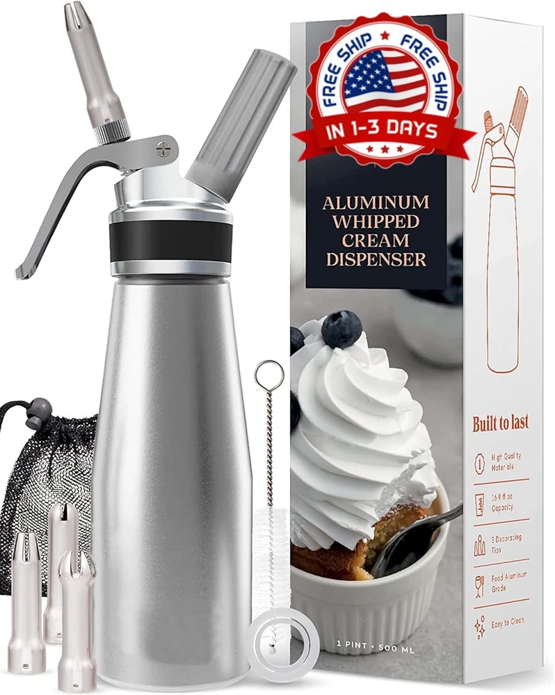Batido de calidad profesional: Crea delicias artesanales personalizadas de forma saludable con la Batidora de Crema. Saca el chef que llevas dentro: Prepara sundaes de helado, ricos mousses de chocolate, crema batida de coco, lattes espumosos, refrescos y café frío con nitrógeno con este batidor de crema. Prepara fácilmente una deliciosa crema batida sin azúcar, sin carbohidratos y con calidad keto. Incluso puedes preparar huevos revueltos esponjosos y mantequilla casera. Recipiente de aluminio para crema batida resistente y duradero: Experimenta la sensación de resistencia con este recipiente y cabezal dispensador de aluminio. El fácil agarre con roscas reforzadas hace que nuestro dispensador de crema batida sea duradero para uso diario y comercial. El acabado premium negro satinado mantiene tu batidora de crema como nueva durante años. Usa las 3 boquillas de decoración para darle a tus tartas, pasteles, waffles y bebidas de crema batida una presentación profesional e inolvidable. Dispensador multiusos: Usa nuestros consejos y recetas para crear postres artesanales, crema keto, café frío con nitrógeno, coberturas saludables para crema batida y mantequilla sin conservantes, en solo minutos. Para la mantequilla, agita el dispensador de 25 a 30 veces, libera el N₂O, abre el dispensador y retira con una espátula. Compatible con todas las marcas de cargadores de crema de N₂O de 8 gramos (los cargadores de óxido nitroso no están incluidos). Fácil de limpiar y mantener: Después de usar, simplemente enjuaga el recipiente de fácil agarre y usa nuestro cepillo para las boquillas de decoración y el cabezal del dispensador. Guarda todos tus accesorios: Incluye 1 bote dispensador de batidor, 3 boquillas de plástico para decorar, 2 soportes de plástico para cargadores, una junta de silicona de repuesto, un cepillo de limpieza y una bolsa de malla para guardar. Los cargadores de crema de N₂O no están incluidos.