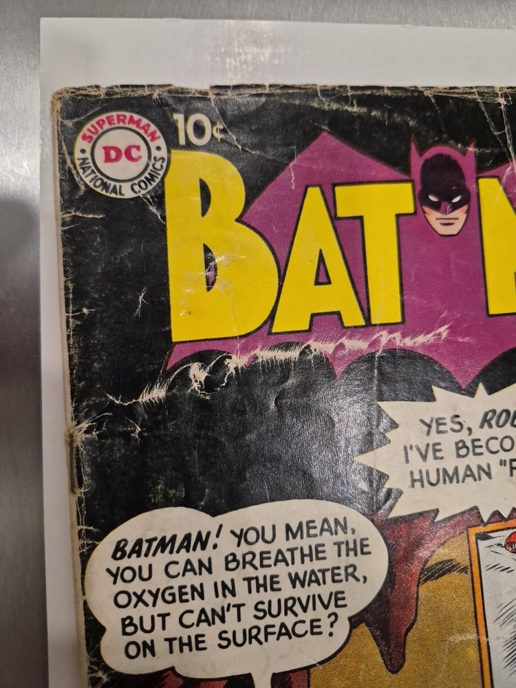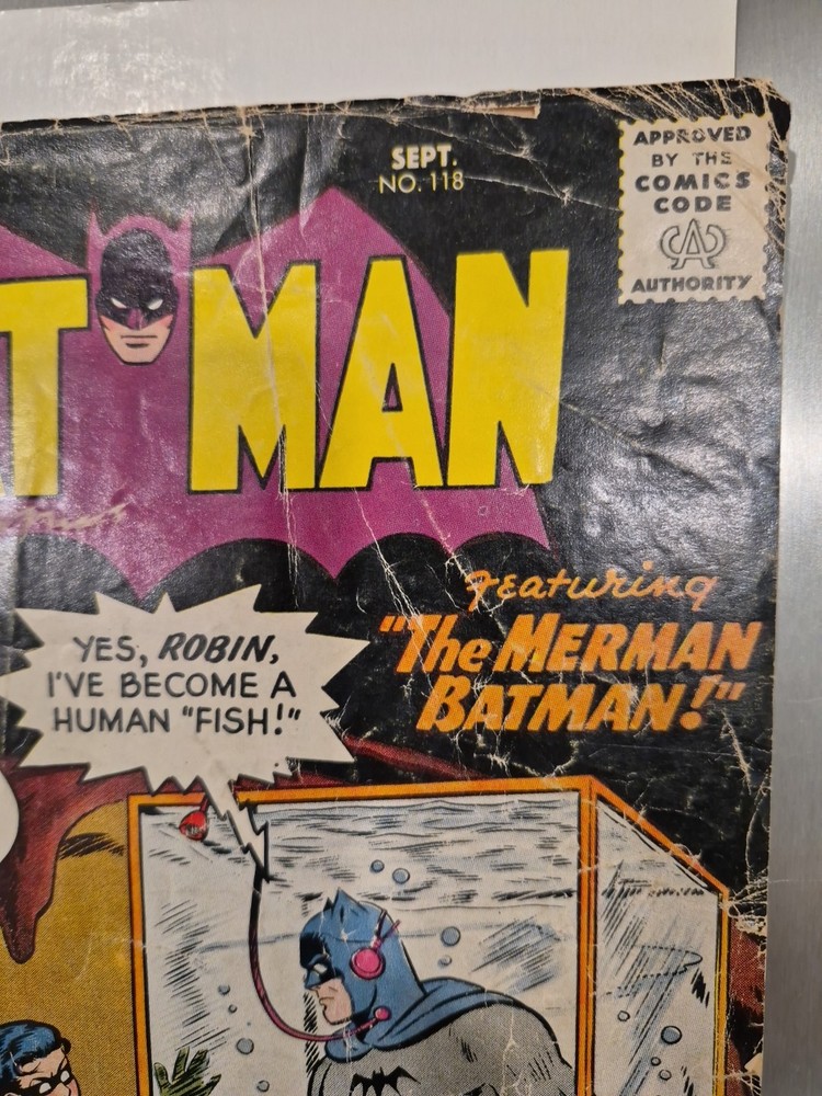 The product is a vintage Batman comic book issue #118 from September 1958, featuring art and writing by Bob Kane and Bill Finger. The comic falls under the superhero genre and includes characters from the Justice League of America. It is a first printing with a color format and is from the Silver Age era of comics. The cover artists are Stan Kaye and Curt Swan. This collectible comic book is a single issue from DC Comics, intended for a general audience, and is a part of the DC Universe.