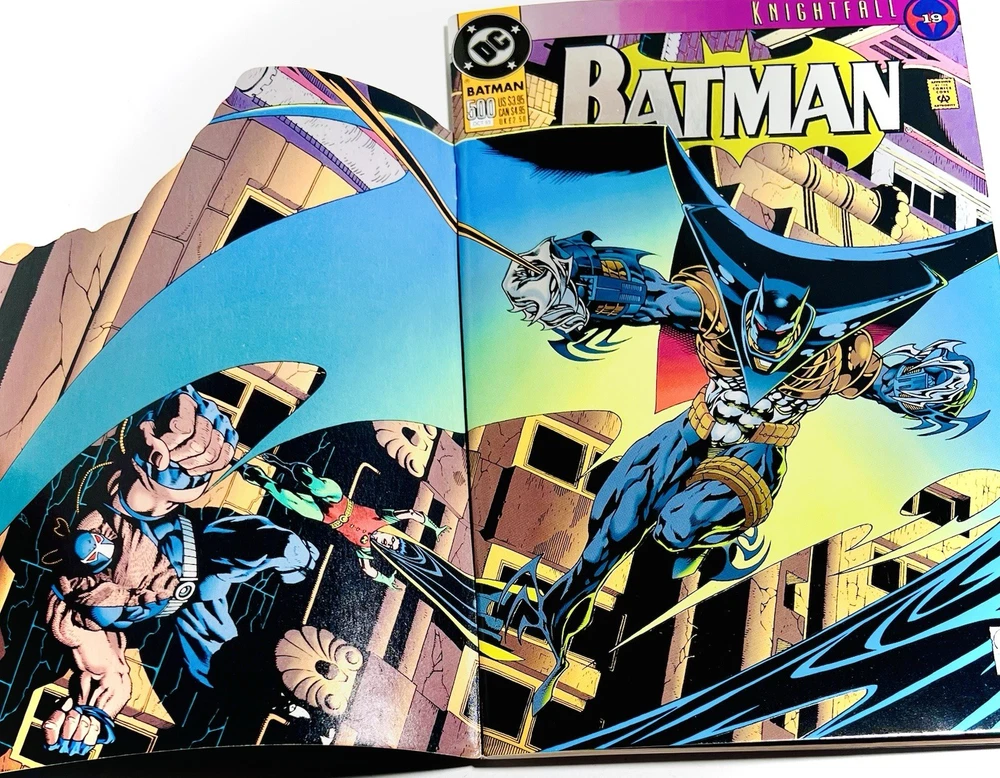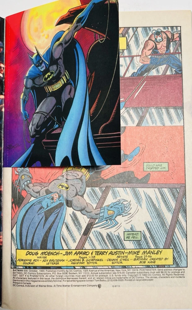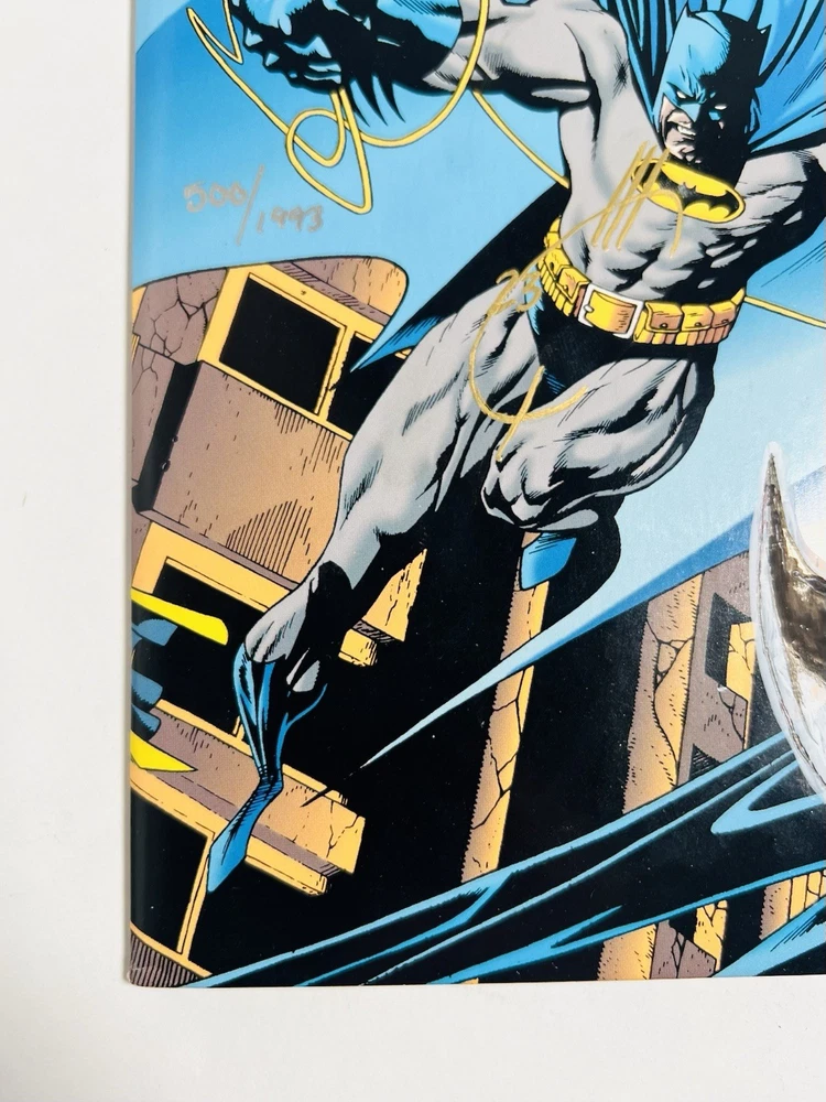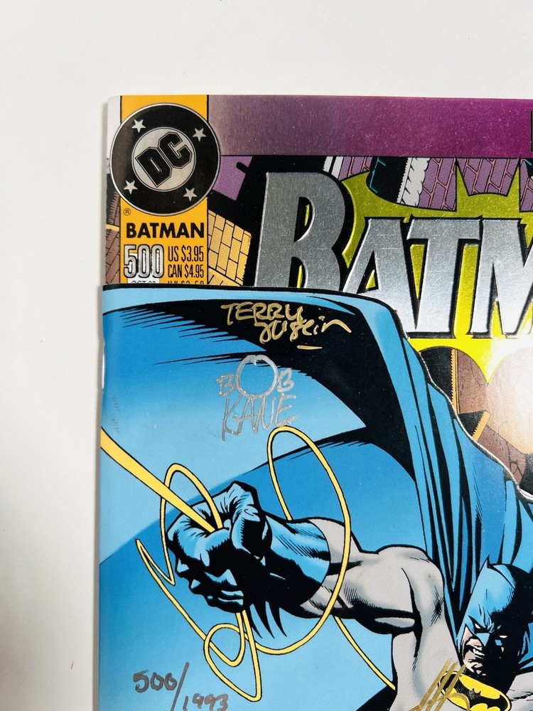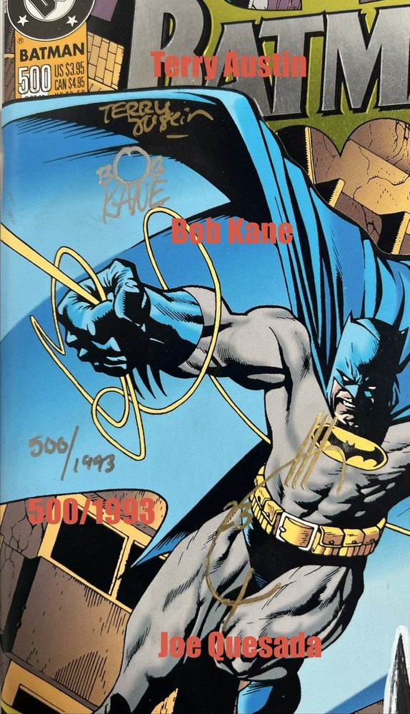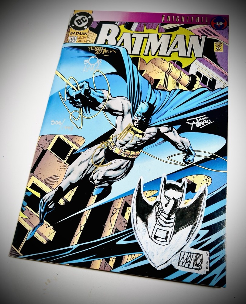 The product is a highly collectible and sought-after Batman #500 1993 Variant Die-Cut Cover signed by five creators including Terry Austin, Joe Quesada, Bob Kane, Jim Aparo, and includes a signed remarque by Mike Manley. This key issue from the US Comics tradition features artwork by Jim Aparo and Terry Austin, cover art by Joe Quesada and Kevin Nowlen, and story by Doug Moench. The story titled "Batman #500 Dark Angel 1: The Fall," features Asrael becoming the new and improved Batman. The story follows Asrael, who makes a high tech bat suit, which is able to even the field against Bane. The comic book, published by DC Comics during the Copper Age, is a first printing with a variant cover, making it a valuable addition to any comic book collector's library. It has also been hand numbered 500/1993.