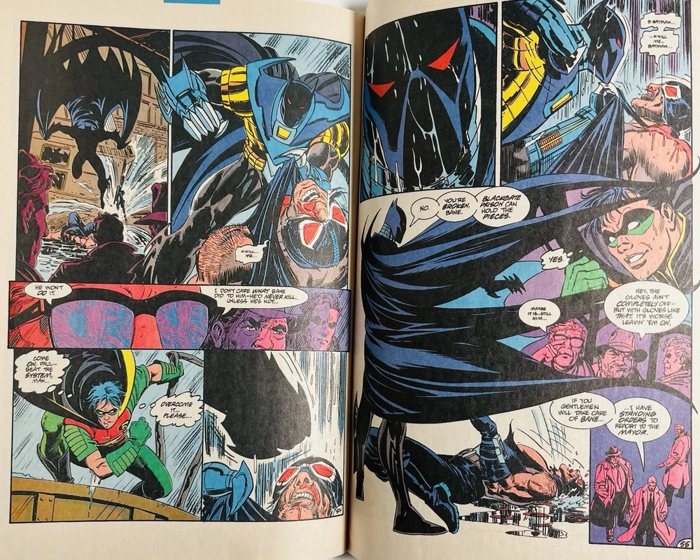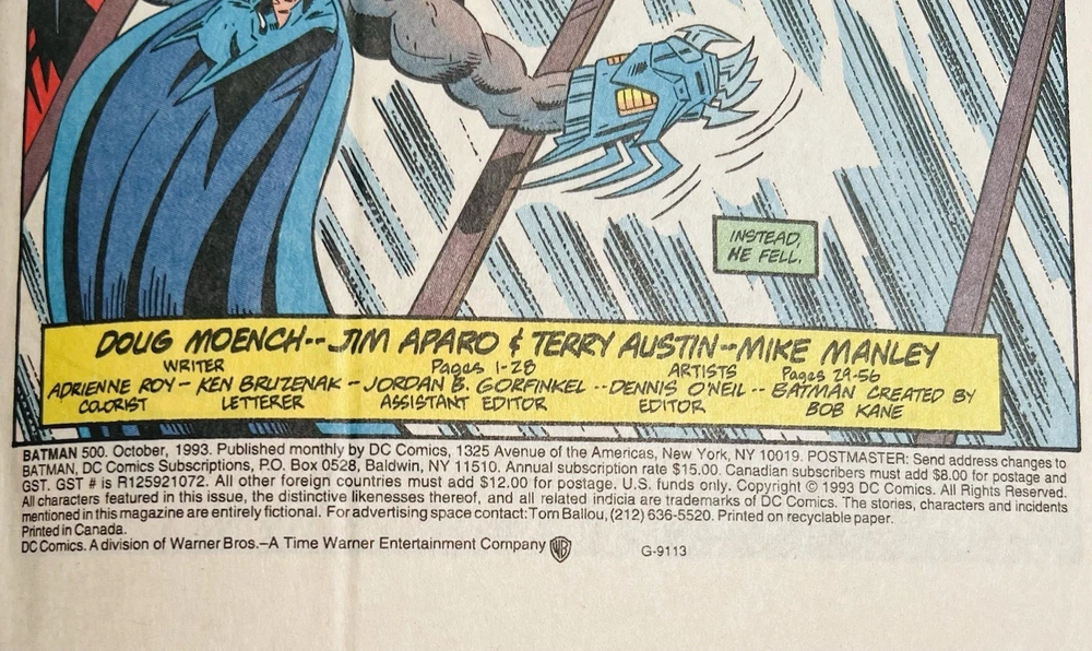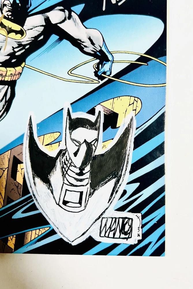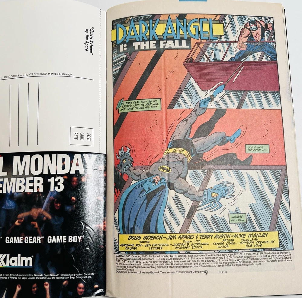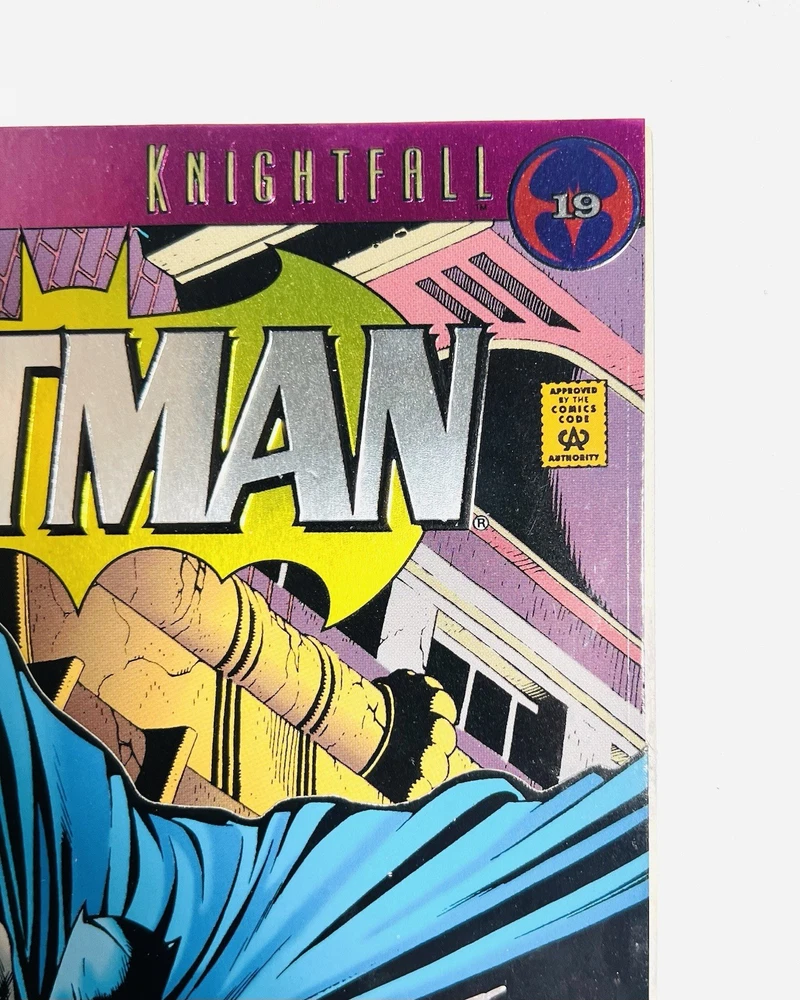 The product is a highly collectible and sought-after Batman #500 1993 Variant Die-Cut Cover signed by five creators including Terry Austin, Joe Quesada, Bob Kane, Jim Aparo, and includes a signed remarque by Mike Manley. This key issue from the US Comics tradition features artwork by Jim Aparo and Terry Austin, cover art by Joe Quesada and Kevin Nowlen, and story by Doug Moench. The story titled "Batman #500 Dark Angel 1: The Fall," features Asrael becoming the new and improved Batman. The story follows Asrael, who makes a high tech bat suit, which is able to even the field against Bane. The comic book, published by DC Comics during the Copper Age, is a first printing with a variant cover, making it a valuable addition to any comic book collector's library. It has also been hand numbered 500/1993.