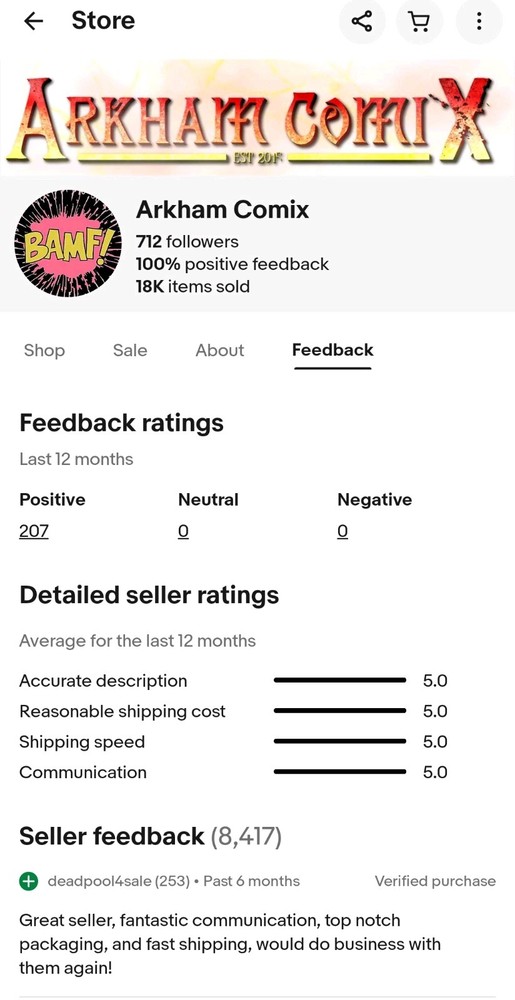 Please see all pics, note any flaws, and ask any questions as this is the exact item you will receive. We ship quickly and securely and all items come from a smoke free pet free environment. If you are happy with our services please give us a follow as we continuously put new things on as often as possible. Please leave us positive feedback and we will return the same for you. Please see our feedback for our old store arkham comix. We were forced to make a new store but have over 8,000 positive feedback spanning 20+ years. Thank you for your business!