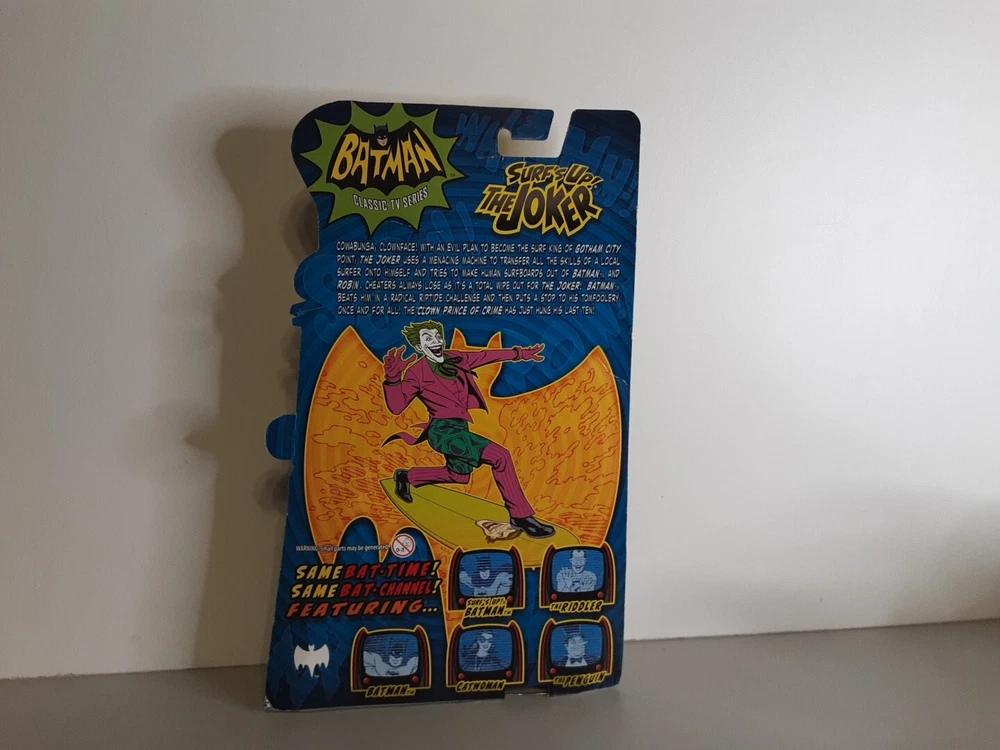 This Mattel Batman Classic TV Series Joker (Surf's Up) action figure is a must-have for any collector or fan of the iconic TV show. The figure is made to the likeness of the 1966 TV series actor Cesar Romero and comes in its original, unopened packaging as pictured. The collector's edition includes a trading card, surf board, display base, and figure. Get your hands on this unique piece of Batman memorabilia today! Ships from Dallas, Texas.