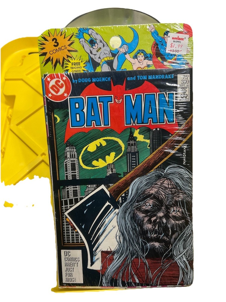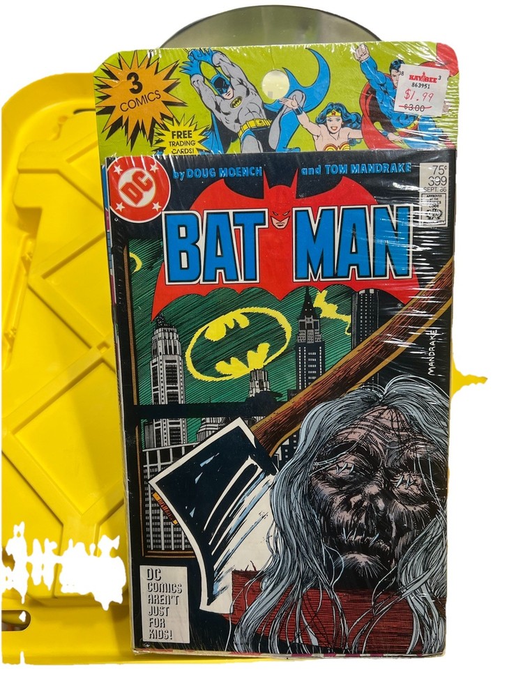 This is a vintage DC Comics Batman 3-comic book pack, factory sealed in original shrink wrap. Includes Batman issues #398 and #399 (1986) plus bonus trading cards pack, featuring classic artwork by Doug Moench and Tom Mandrake. This multi-pack was marketed for kids in the 1980s and is now a highly collectible sealed DC comic set. The packaging is intact with visible original retail price sticker, making it a great investment piece for comic collectors. Perfect for Batman fans, DC collectors, vintage comic enthusiasts, or graded comic investors.