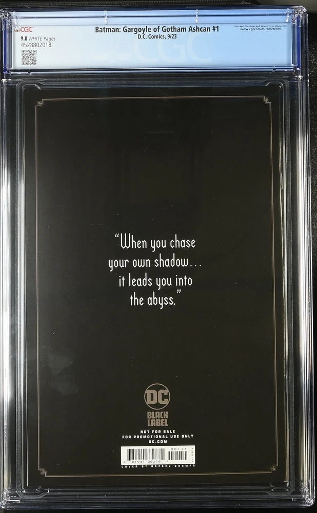 Welcome comic book community to the Destroyer of Worlds Comics store and our listing for Batman: Gargoyle of Gotham Ashcan 1 CGC 9.8 We are a small shop and our focus is to bring the best buying experience to our customers. Destroyer of Worlds Comics is an authorized CGC Dealer which grants us access to the CGC database for all graded book details which are included in every listing along with the hi resolution scans taken by CGC. We know that buying comics online can be stressful so we proactively eliminate the most common sources of stress by packing our comics professionally using BCW Graded Comic Bags and then placing them into sturdy 200 lb test boxes to withstand any mishandling while in transit with the carrier. When we receive an order it becomes top priority and your order is immediately pulled from inventory and packaged properly to arrive in your hands as quickly as possible. Our goal is for you to not worry about your order arriving late or guessing when it will be shipped. When you buy from our store you will also receive hassle free 30 day returns and we will cover the shipping cost back to us if you decide to make a return. We hope our commitment to protecting comics and servicing our customers provides a trustworthy and pleasant experience and thank you for considering us. The images in the listing are the actual item you will receive after purchasing. If you have any questions prior to making a decision please reach out and we will answer promptly. We are located in southern Florida not far from CGC and add new listings regularly so please take a look at our other listings if you are looking for CGC graded books and favorite us as a seller if you enjoyed buying from us. CGC Certification Info Title: Batman: Gargoyle of Gotham Ashcan Issue: 1 Grading Company: CGC Grade: 9.8 CGC Cert #: 4528802018 Page Quality: WHITE Issue Date: 9/23 Issue Year: 2023 Publisher: D.C. Comics Grade Category: Modern Total Graded By CGC: In 9.8: 12 Grader Notes: None CGC Census Report CGC Database Query Time: 2025-01-21 14:07:28 Mint 10.0: 0 Mint 9.9: 0 Near Mint/Mint 9.8: 12 Near Mint+ 9.6: 13 Near Mint 9.4: 1 Near Mint- 9.2: 2 Very Fine/Near Mint 9.0: 0 Very Fine+ 8.5: 1 Very Fine 8.0: 0 Very Fine- 7.5: 0 Fine/Very Fine 7.0: 0 Fine+ 6.5: 0 Fine 6.0: 0 Fine- 5.5: 0 Very Good/Fine 5.0: 0 Very Good+ 4.5: 0 Very Good 4.0: 0 Very Good- 3.5: 0 Good/Very Good 3.0: 0 Good+ 2.5: 0 Good 2.0: 0 Good- 1.8: 0 Fair/Good 1.5: 0 Fair 1.0: 0 Poor 0.5: 0 Case Condition We understand every collector has a unique set of standards when it comes to condition of the case and we often receive entire submissions with defects therefore we make every effort to note those conditions in the listing since they are often not visible in the scanned images. Nearly every case we receive from CGC has at least one of the following defects: grade on label not centered, label mounted crooked, newton rings, scuffing, scratches, case stress from the sealing process or inner well movement. To keep you informed before making a purchase decision we note major defects like cracks, newton rings, heavy scratches, and major scuffing in the listing but do not list the minor ones. If there are any flaws you dislike in particular please message us and we would be happy to review any of our listings and get back with you with every flaw we can find on the case. In the event the case arrives and is not to your satisfaction please reach out and we will offer to replace it if we have one available in better condition or a return can be opened at no cost within 30 days to receive a full refund. Pricing All fixed price listings are firm. We price our books at fair value according to recently sold listings but do realize prices fluctuate frequently when auctions are involved so we sometimes create auction listings for a chance at reduced prices for those who enjoy the thrill of the hunt. We also regularly run promotional coupon codes for volume discounts on orders of multiple fixed price listings so be sure to add listings to your watchlist and check back frequently. Shipping Policy Destroyer of Worlds Comics typically ships your items same day or next business day after payment is made. CGC graded comics are wrapped both vertically and horizontally in 5/16 inch bubble wrap and then placed into a 200 lb test corrugated box for protection. Ungraded comics are shipped in Gemini Comic Mailers. Combined shipping is offered for both domestic and international buyers. Please note for international orders any additional import fees duties taxes or customs charges are the sole responsibility of the buyer. These charges are determined by your country's customs office and we unfortunately have no influence over the amount charged or the duration of the assessment process due to the customs forms being automated. Please be aware that customs procedures and policies vary from country to country. If you have any concerns or questions regarding import fees duties or taxes we recommend contacting your local customs office before making a purchase. Return Policy Free returns available on all CGC graded books within 30 days of purchase.